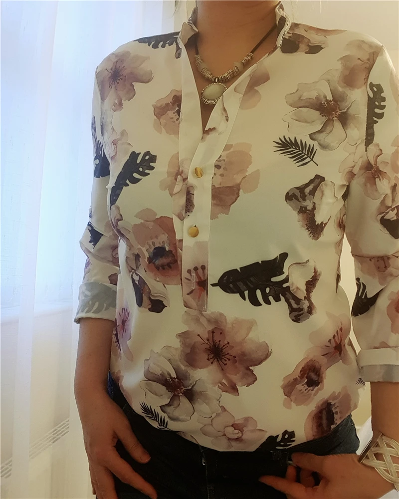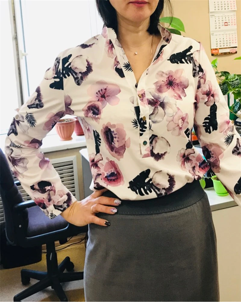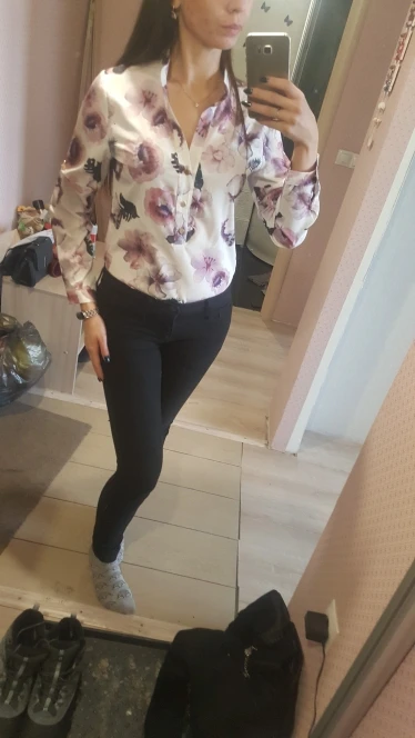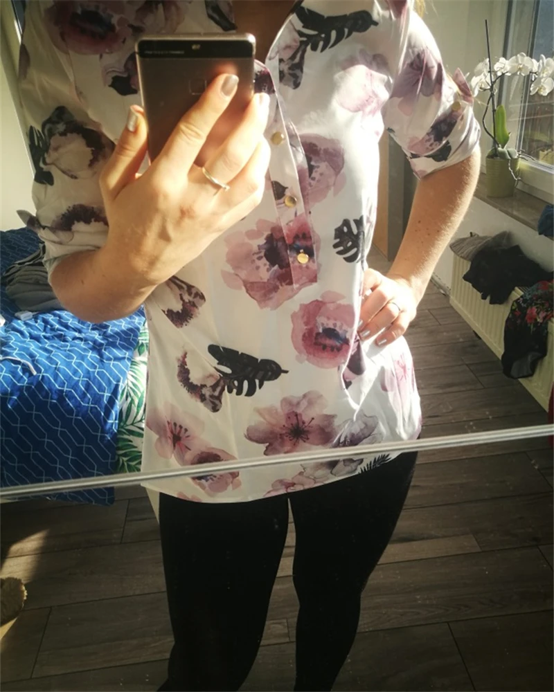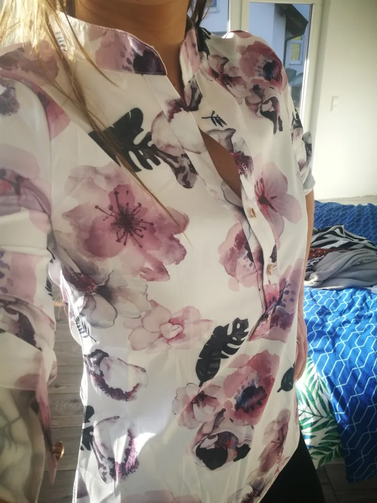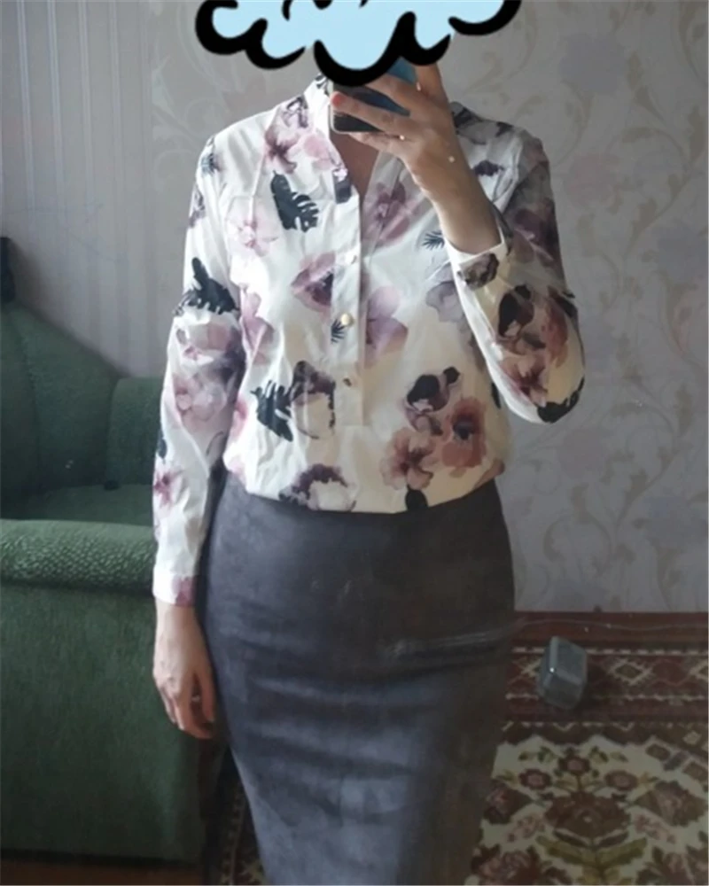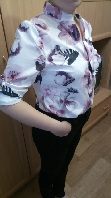 A good blouse, l corresponds to 48 size, the fabric does not shine through, the print is pleasant.