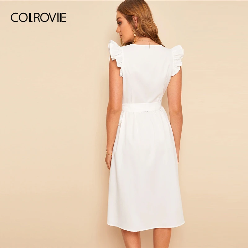 ⇒FREE SHIPPING⇐ 2019 Summer Boho Deep V Neck Sleeveless Midi Dresses White Solid Ruffle Armhole Belted Surplice Wrap Sheath Dress JKP1493