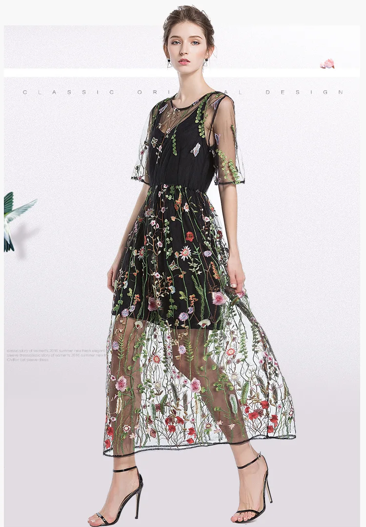 FREE SHIPPING 2019 Summer Two Piece Embroidery Lace Mesh Dress JKP13416