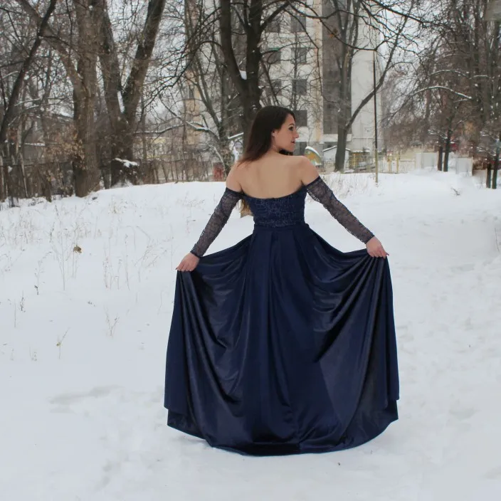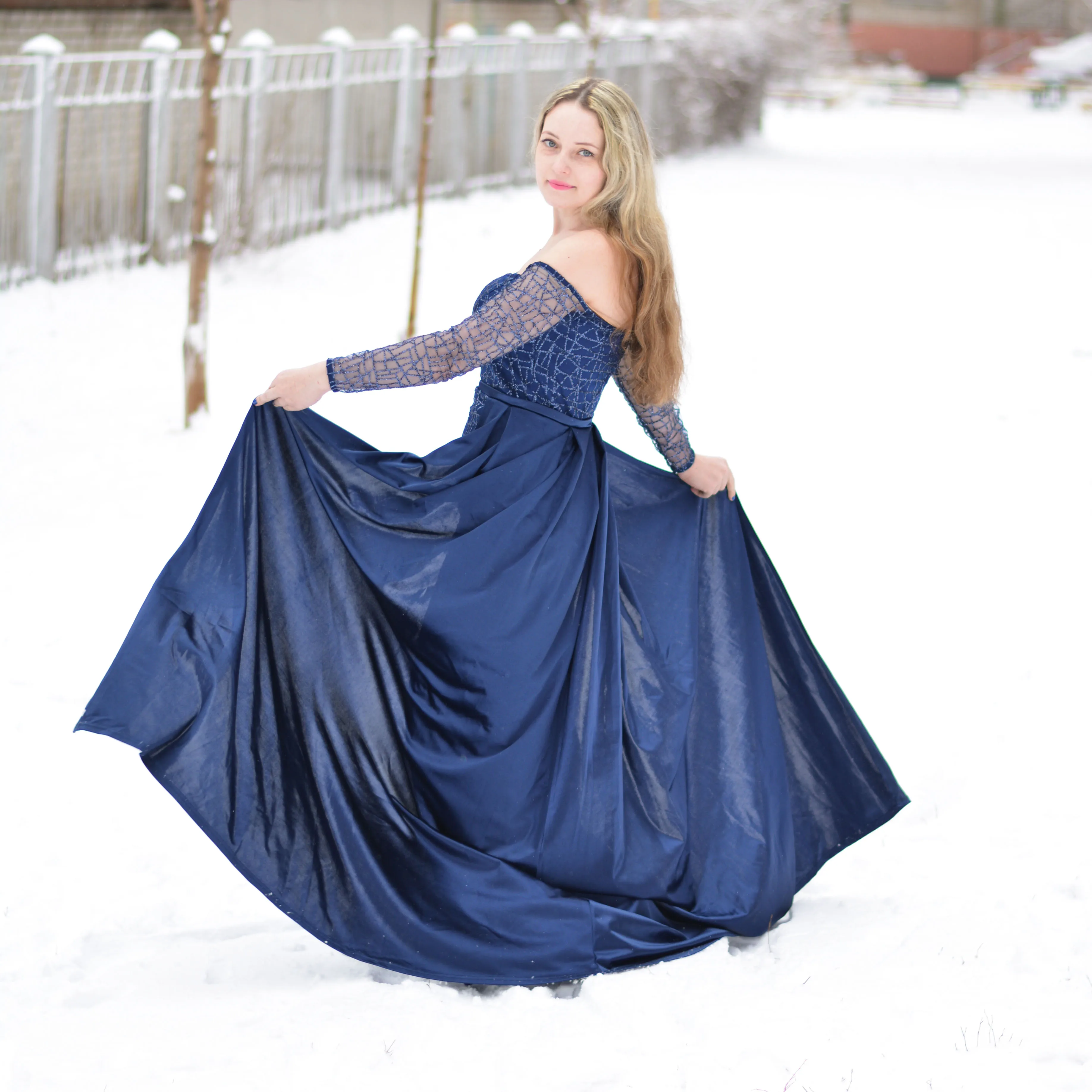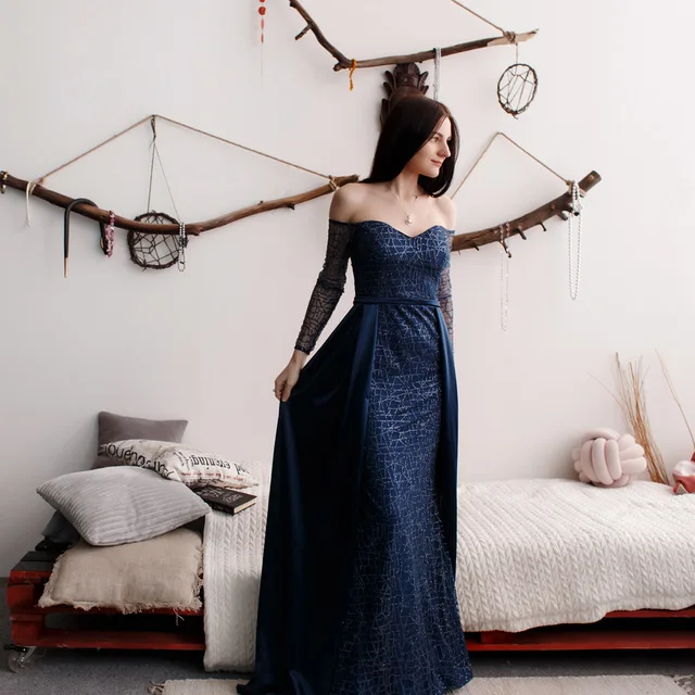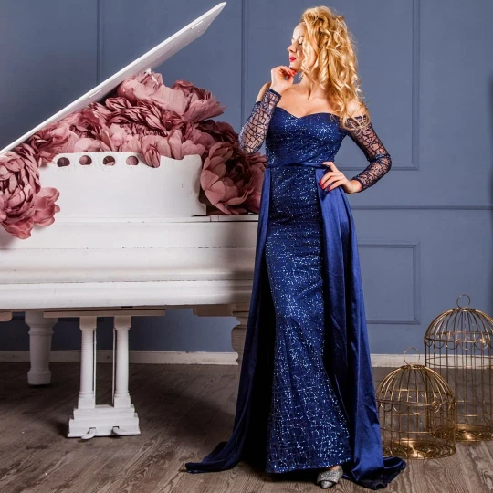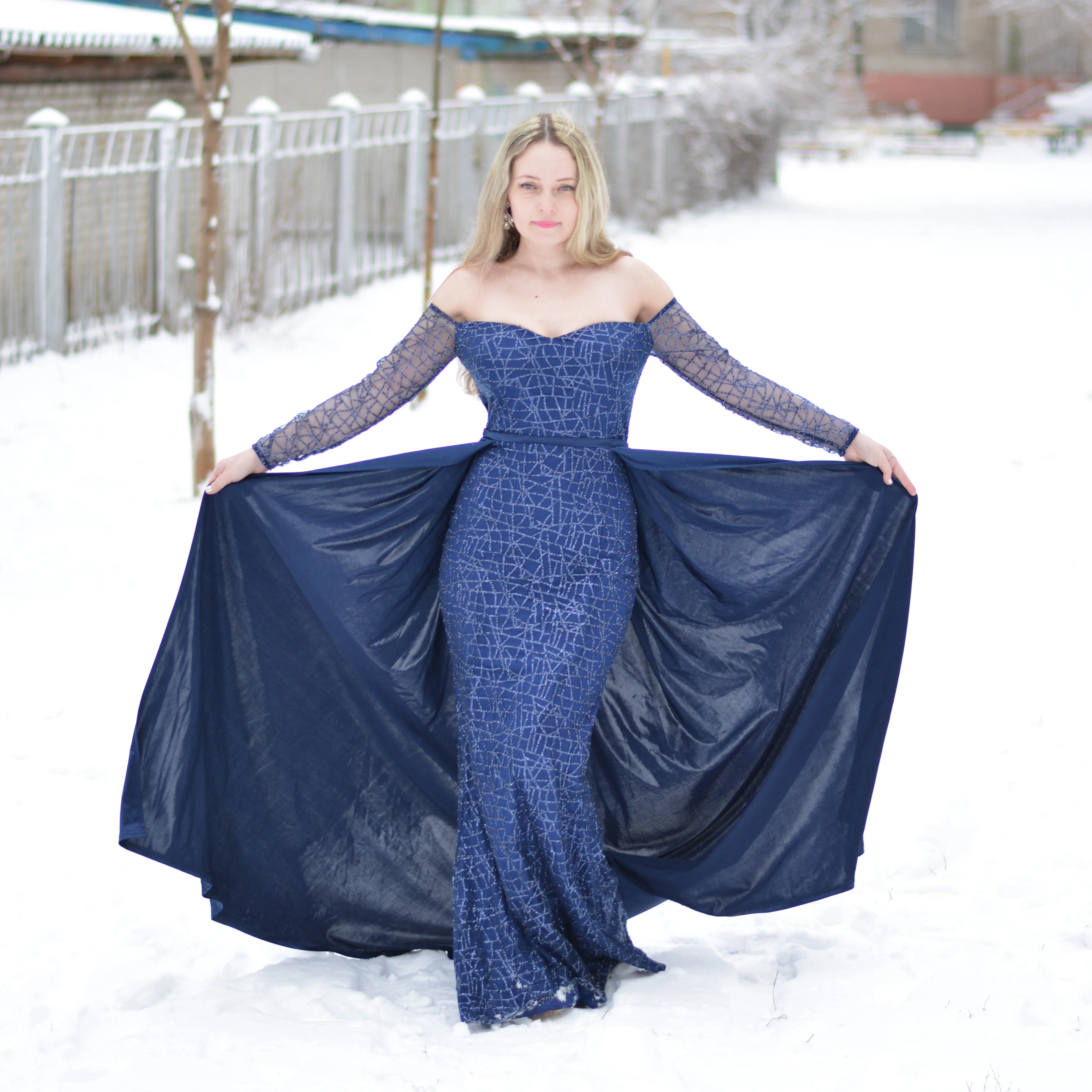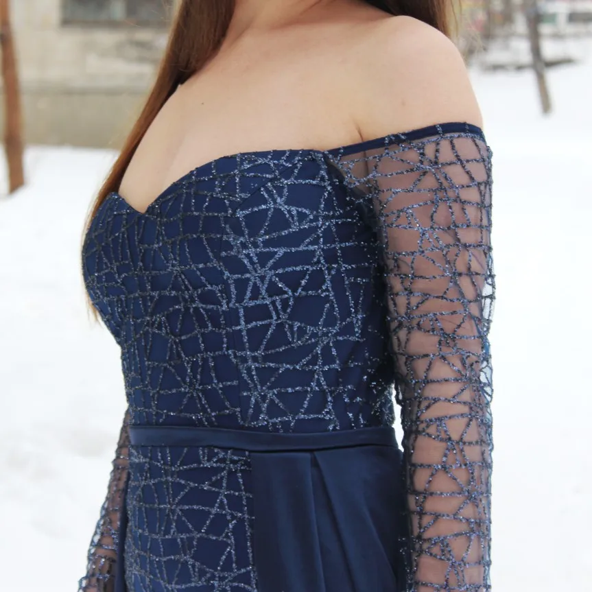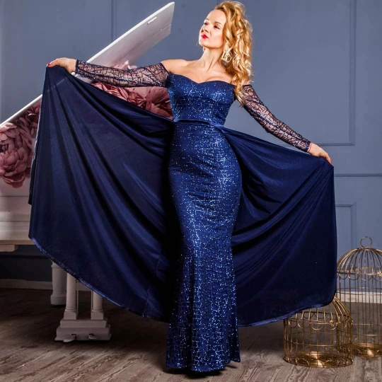 A sparkling dress, noble blue, fades magically. The train skirt of dense satin looks expensive. The sleeves of the dress and the top layer are sewn from a mesh that is decorated with sequins. Sequins crumble. Leaving the train. I think this is superfluous, since the layer of them is dense and bulky. Shipping standard with tracking. On the height of 164 cm the dress came under the heel. On the parameters 89-66-92 cm size m is too small. Fastens behind with a zipper. The quality is excellent. The dress is fabulous, i really like it!