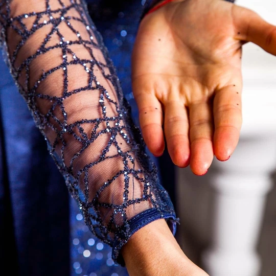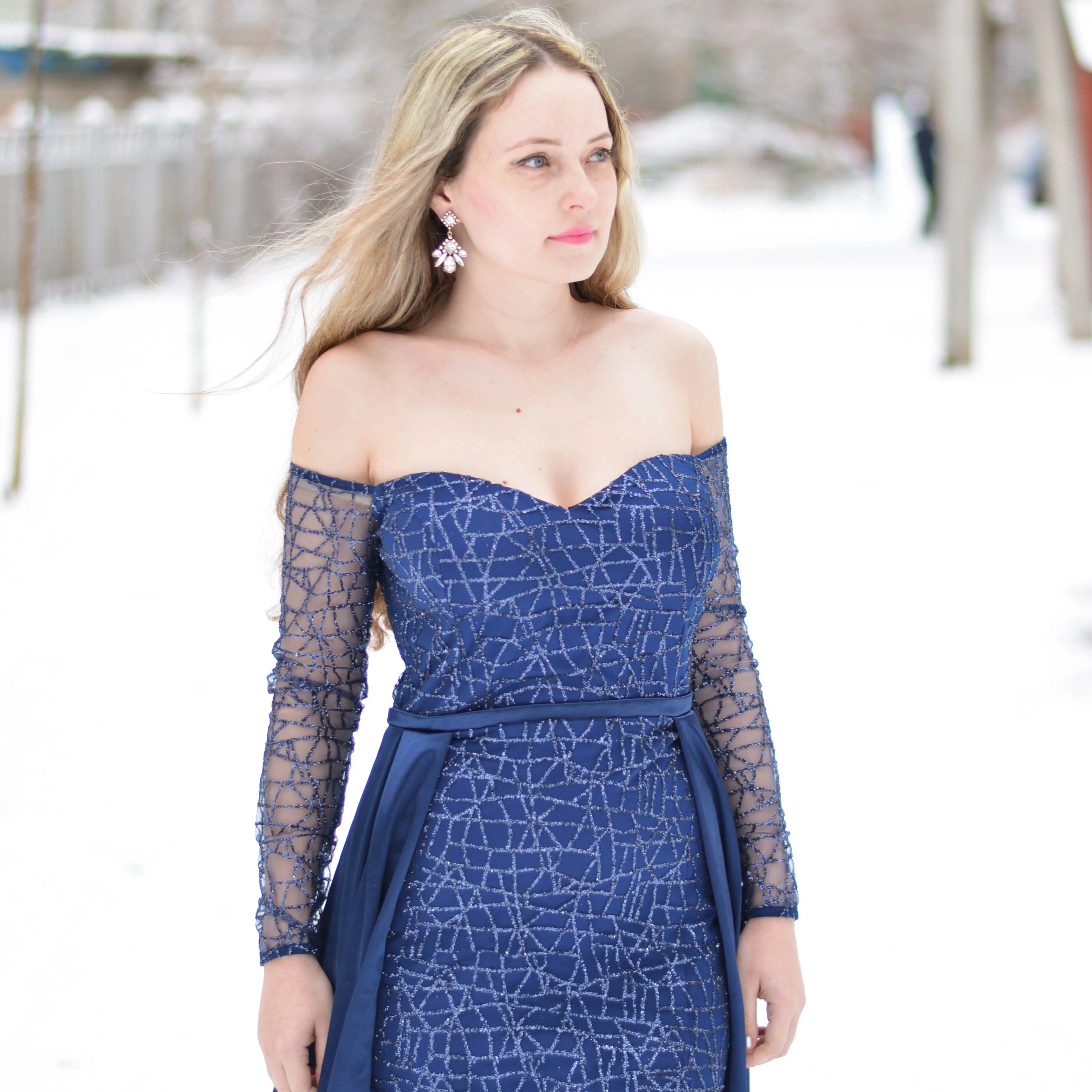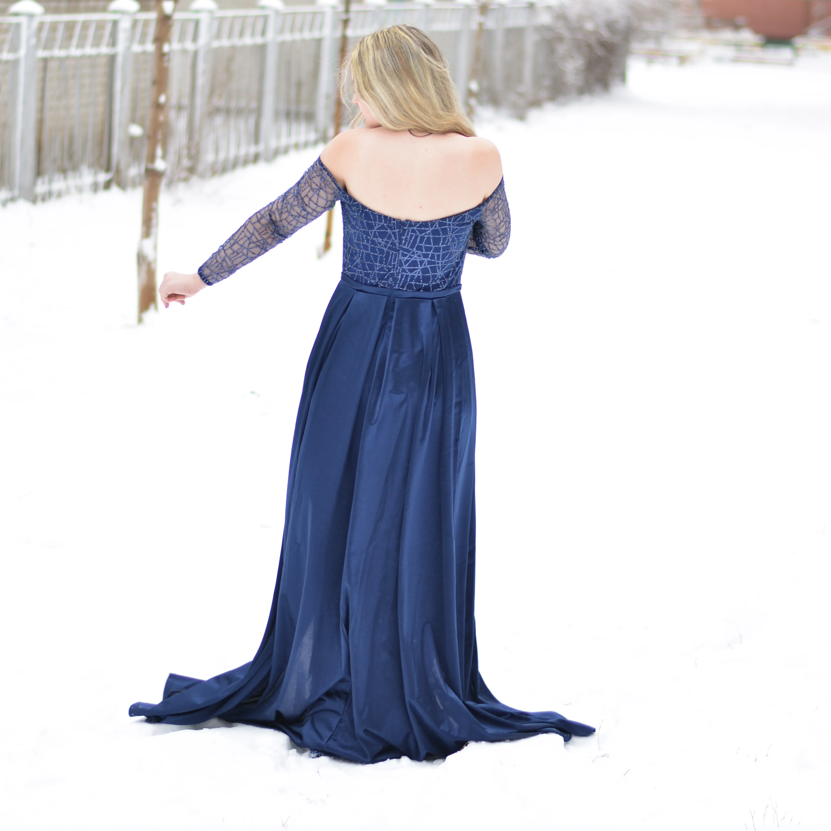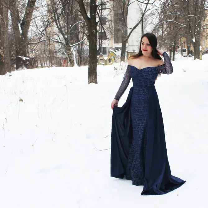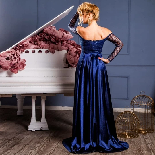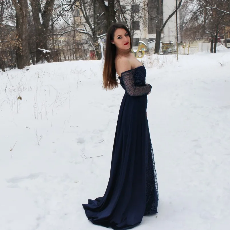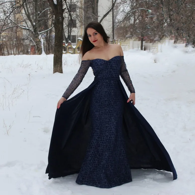A sparkling dress, noble blue, fades magically. The train skirt of dense satin looks expensive. The sleeves of the dress and the top layer are sewn from a mesh that is decorated with sequins. Sequins crumble. Leaving the train. I think this is superfluous, since the layer of them is dense and bulky. Shipping standard with tracking. On the height of 164 cm the dress came under the heel. On the parameters 89-66-92 cm size m is too small. Fastens behind with a zipper. The quality is excellent. The dress is fabulous, i really like it!