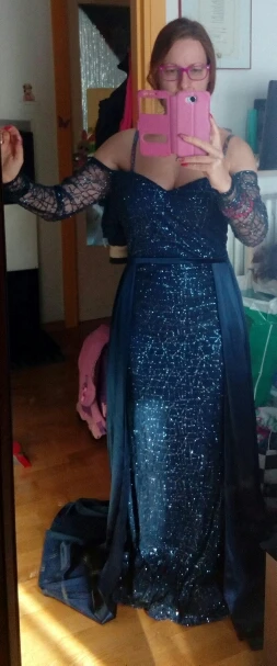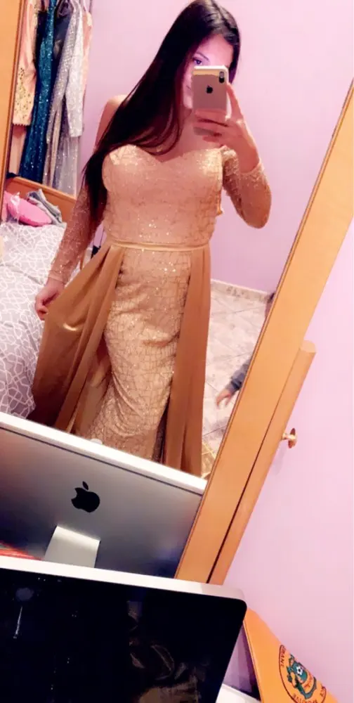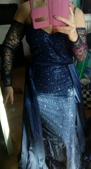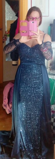 The dress is luxurious! Looks expensive and noble. Emphasizes the figure. Size s sat on the figure on the parameters 88-67-96, height 164 cm. The fabric is pleasant to the body, the sequins are glued. Sprinkle and leave a sparkling trail. The train is sewn, it is longer than the dress. The model is interesting and attracts attention. My detailed review in instagram @ Primma