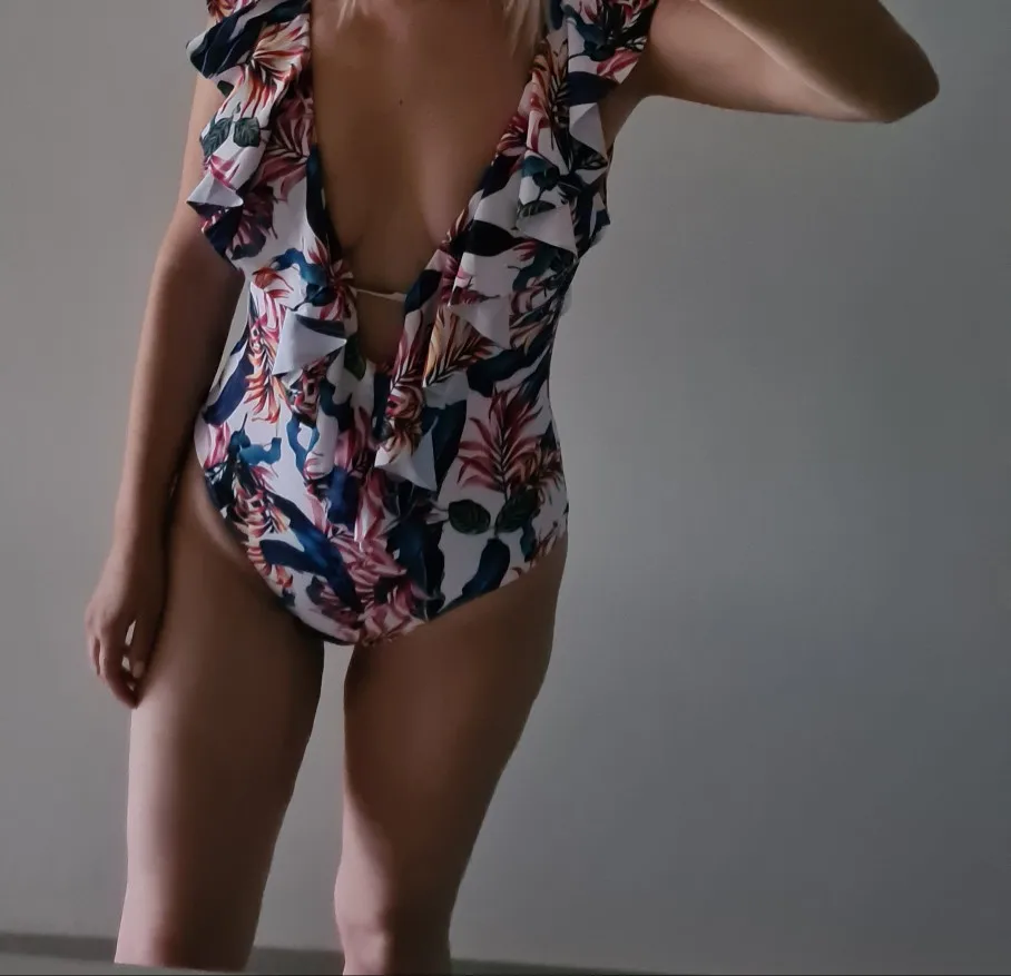Эффектный купальник с глубоким декольте с воланами Очень красивый купальник. Очень качественный. Ткань Гладкая плотная хорошо тянется и не просвечивает. В груди есть вкладки. На рост 172 не короткий. На параметры 88 – 60 – 92 и вес 55 кг подошел идеально в размере М.