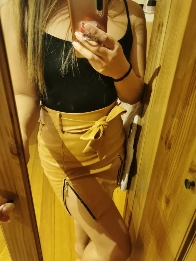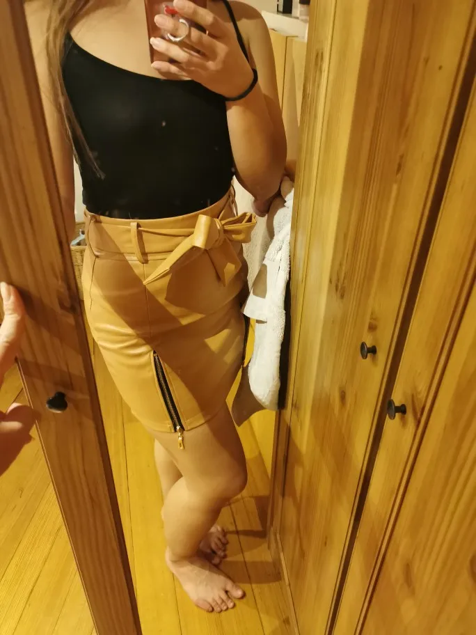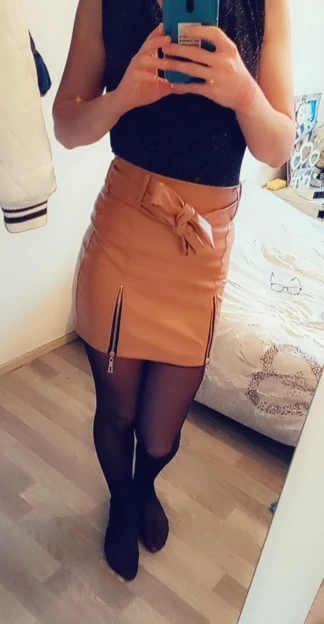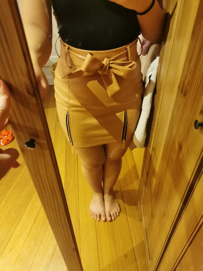 The skirt came innert 12 days guet packed. The PU leather feels very comfortable on the skin to! Unfortunately clamps the zipper a bit and the seam when zipper is not clean, slightly unstabile. (See picture) Otherwise all looks super great! Thank you