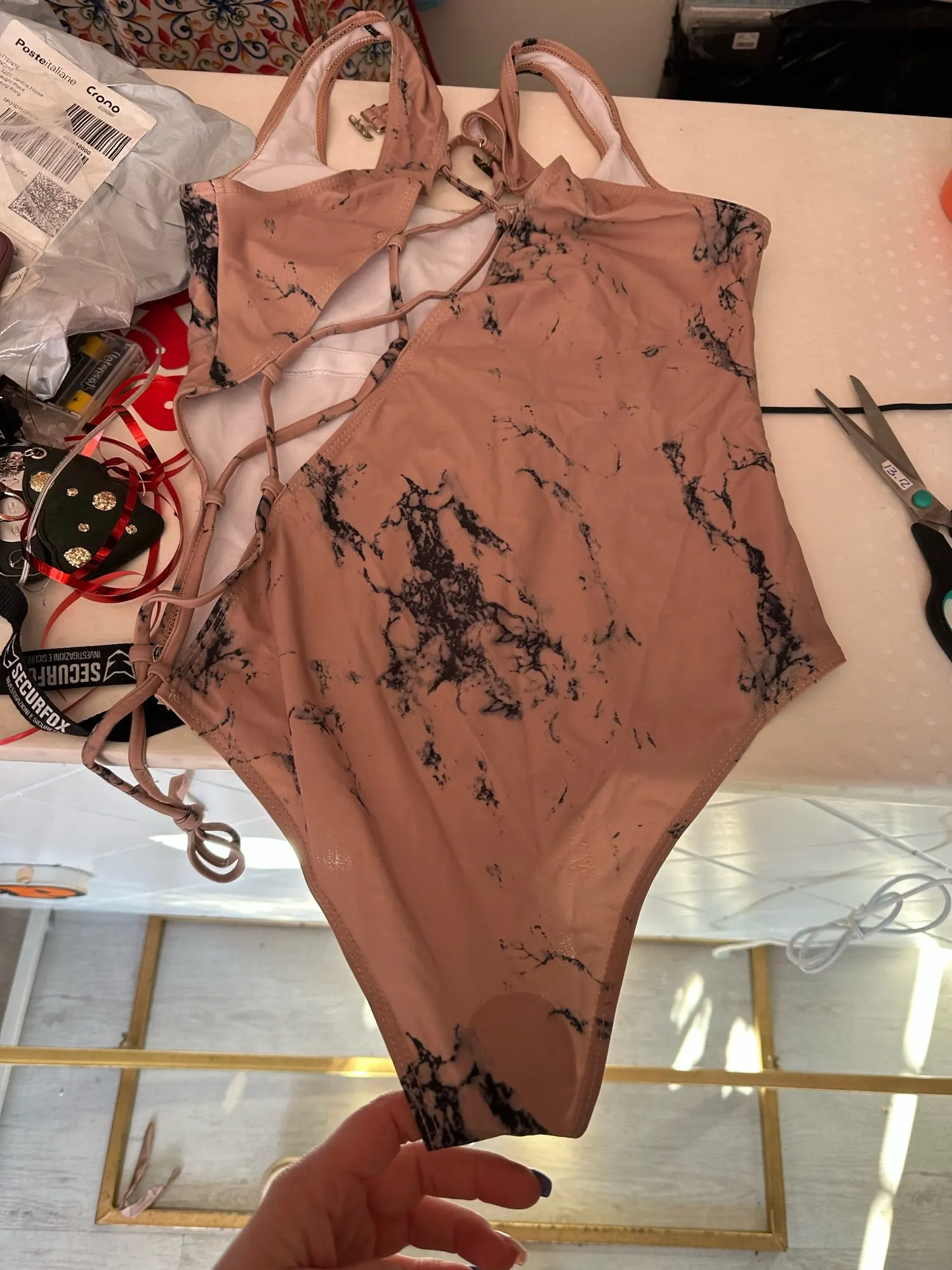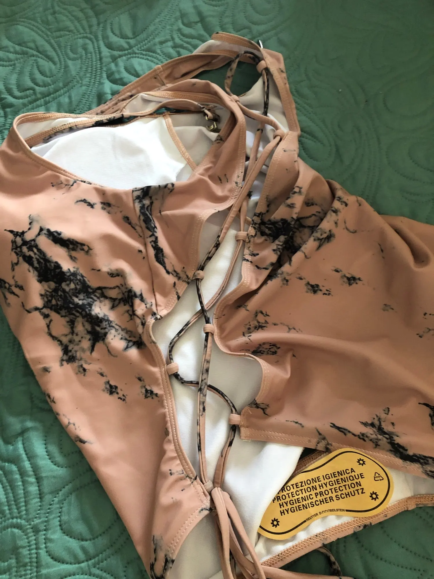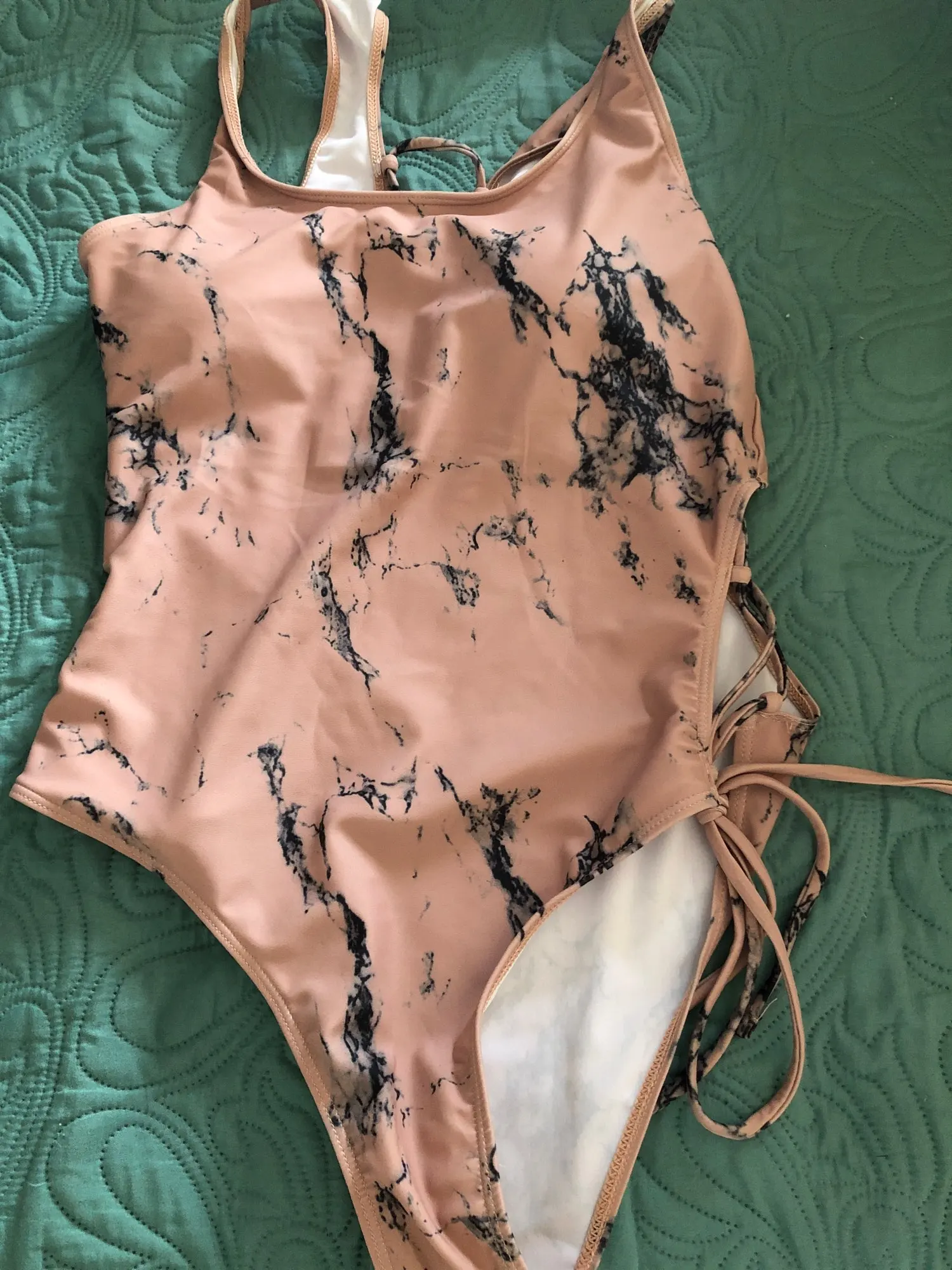 Swimsuit arrived in two weeks in Ukraine. Height for growth 170 close to. 90 top and 95 thighs fit well, you can adjust the lacing and the back will not stout. The picture is not as clear as the picture, but the quality is cool.