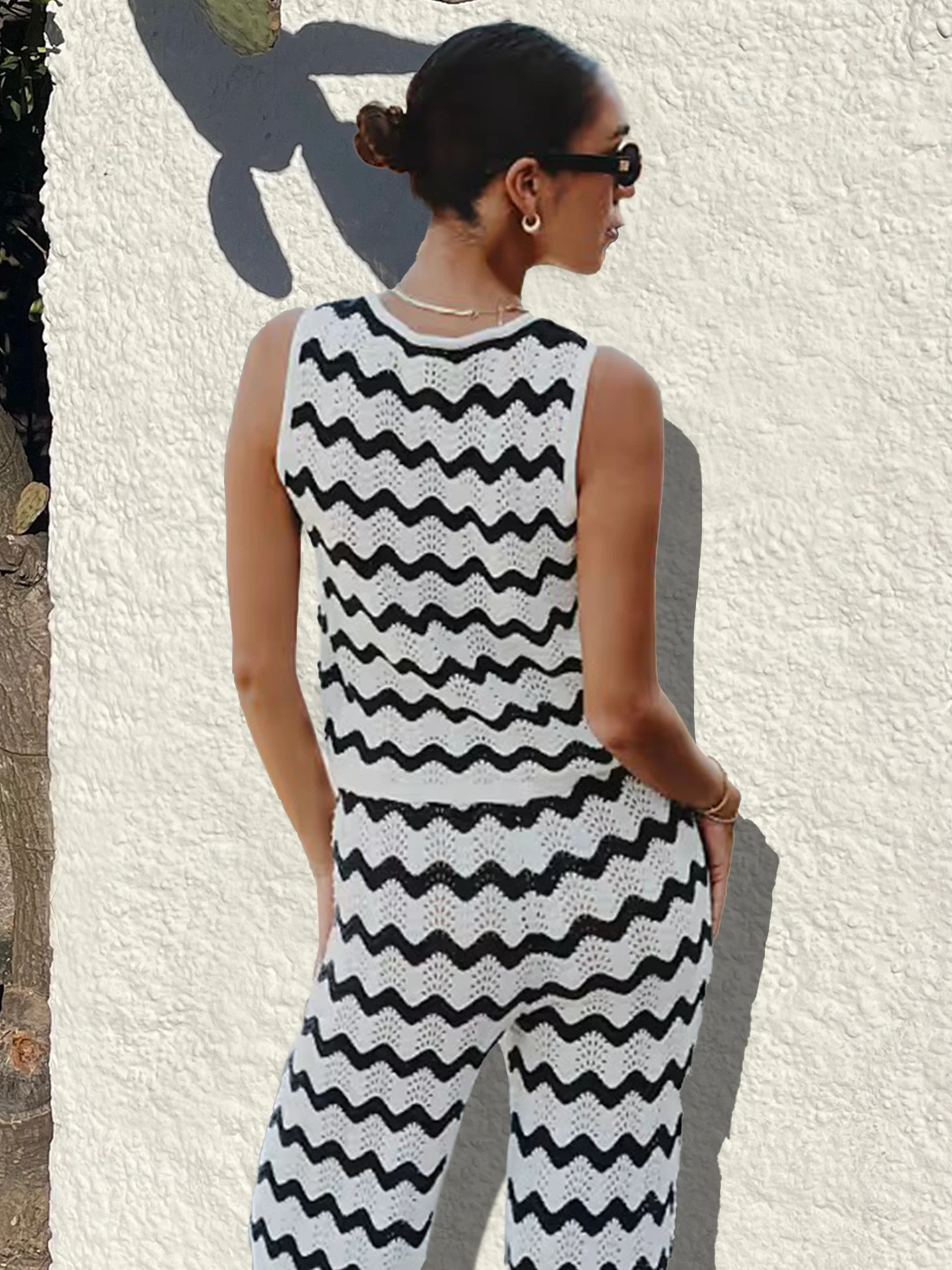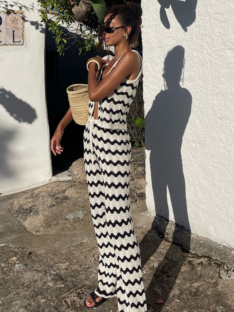 FREE SHIPPING 2025 Wave Striped Sleeveless Tie Front Top And Wide Leg Pants Knitwear Beach Outfits JKP7407