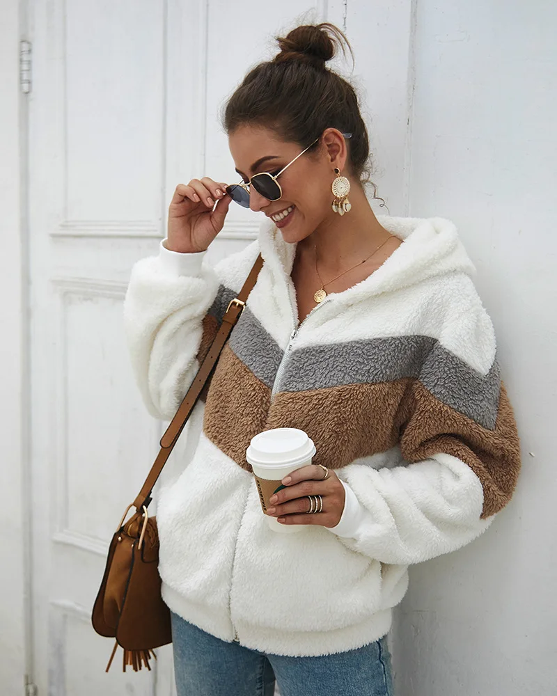 FREE SHIPPING Autumn Winter Patchwork Plush Jacket Women Warm Long Sleeve Thicken Teddy Jacket With Pocket Outerwear Overcoat Casual Streetwear JKP2782