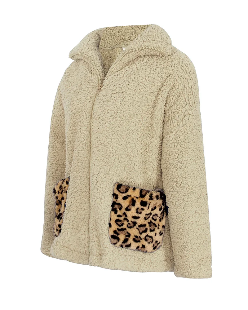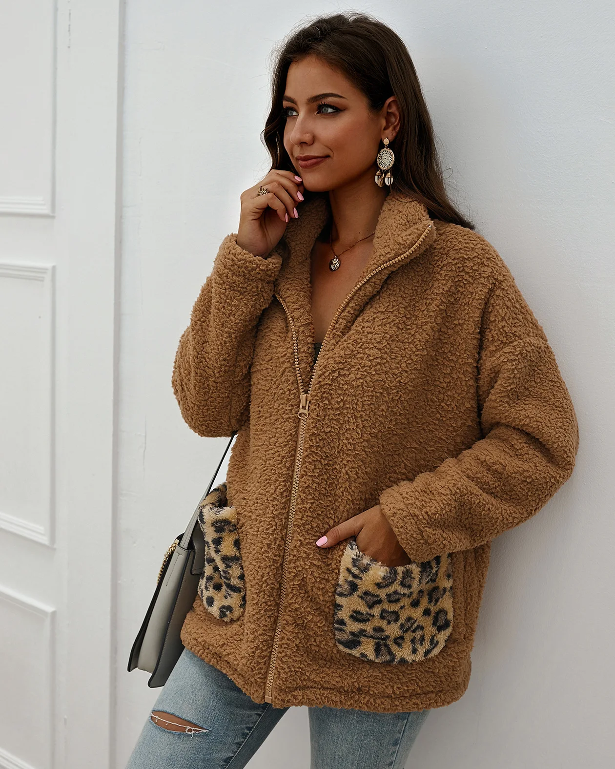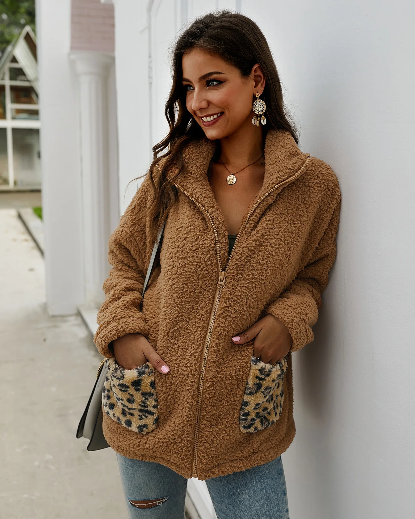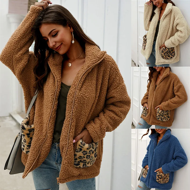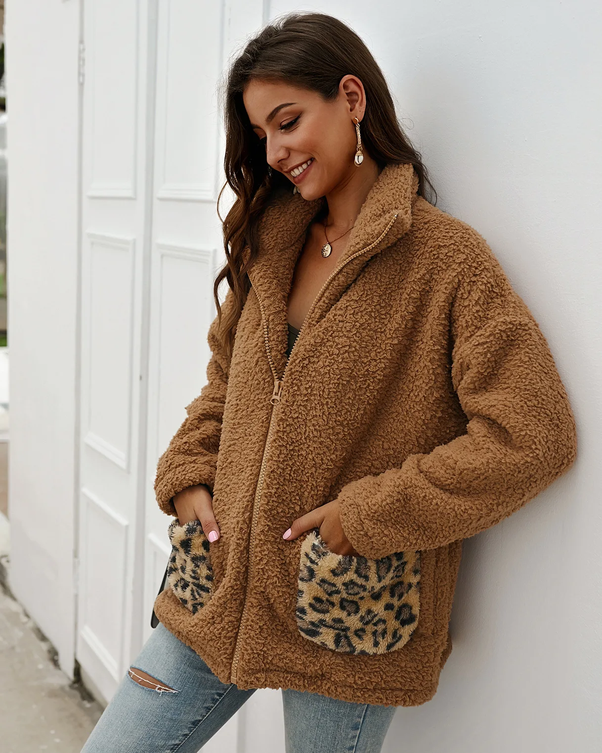 FREE SHIPPING Autumn Winter Plush Coat Casual Soft Leopard Pocket Zipper Jacket Women Cardigan Loose Outwear Ladies Warm Coats JKP2785
