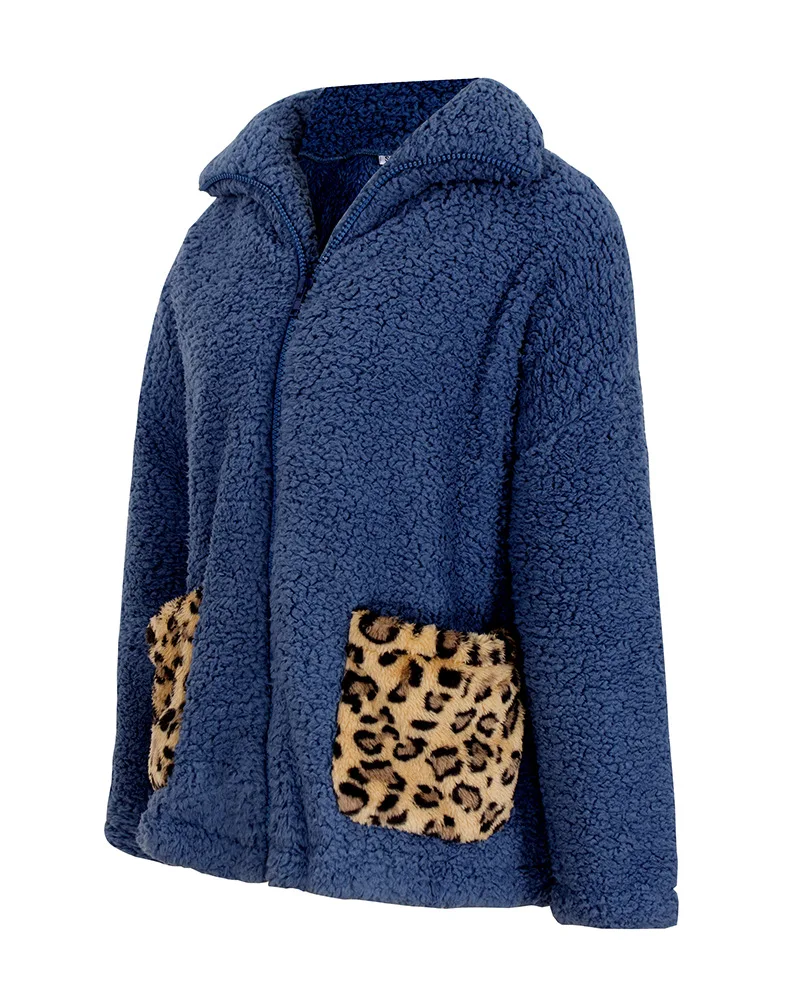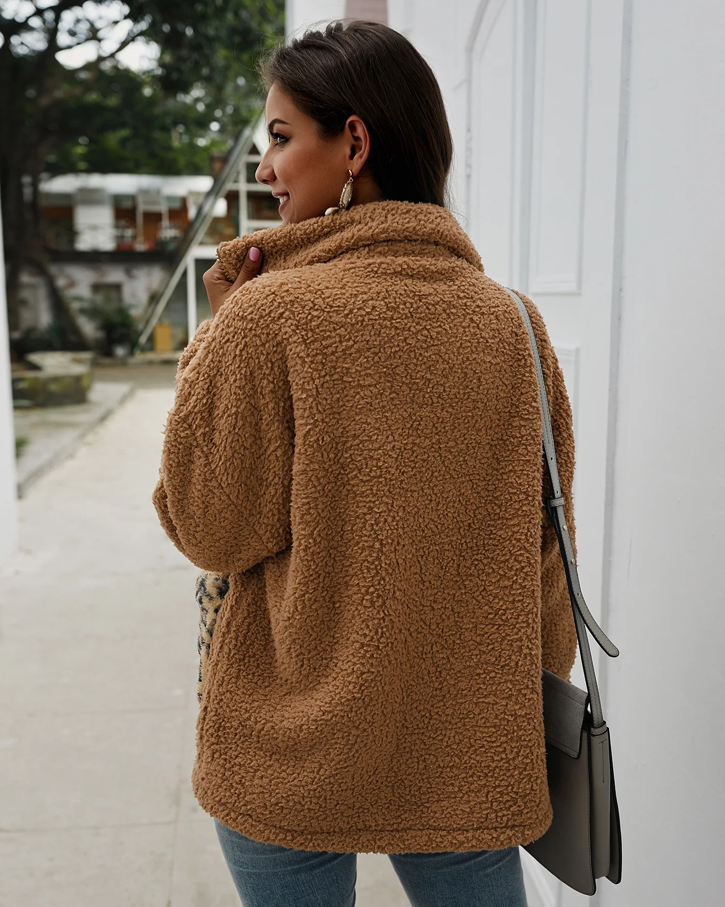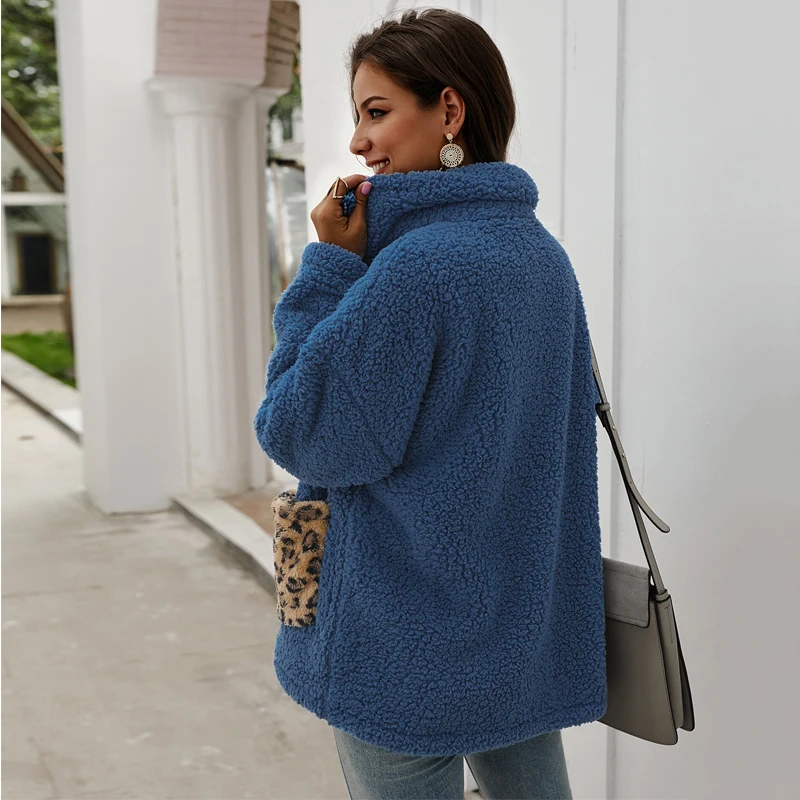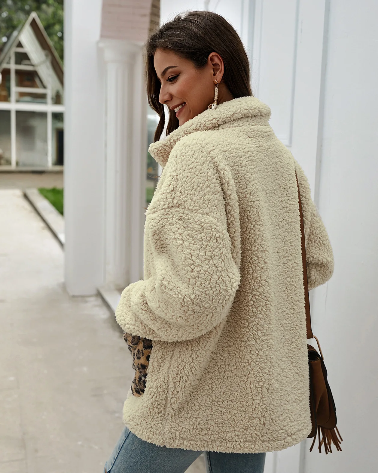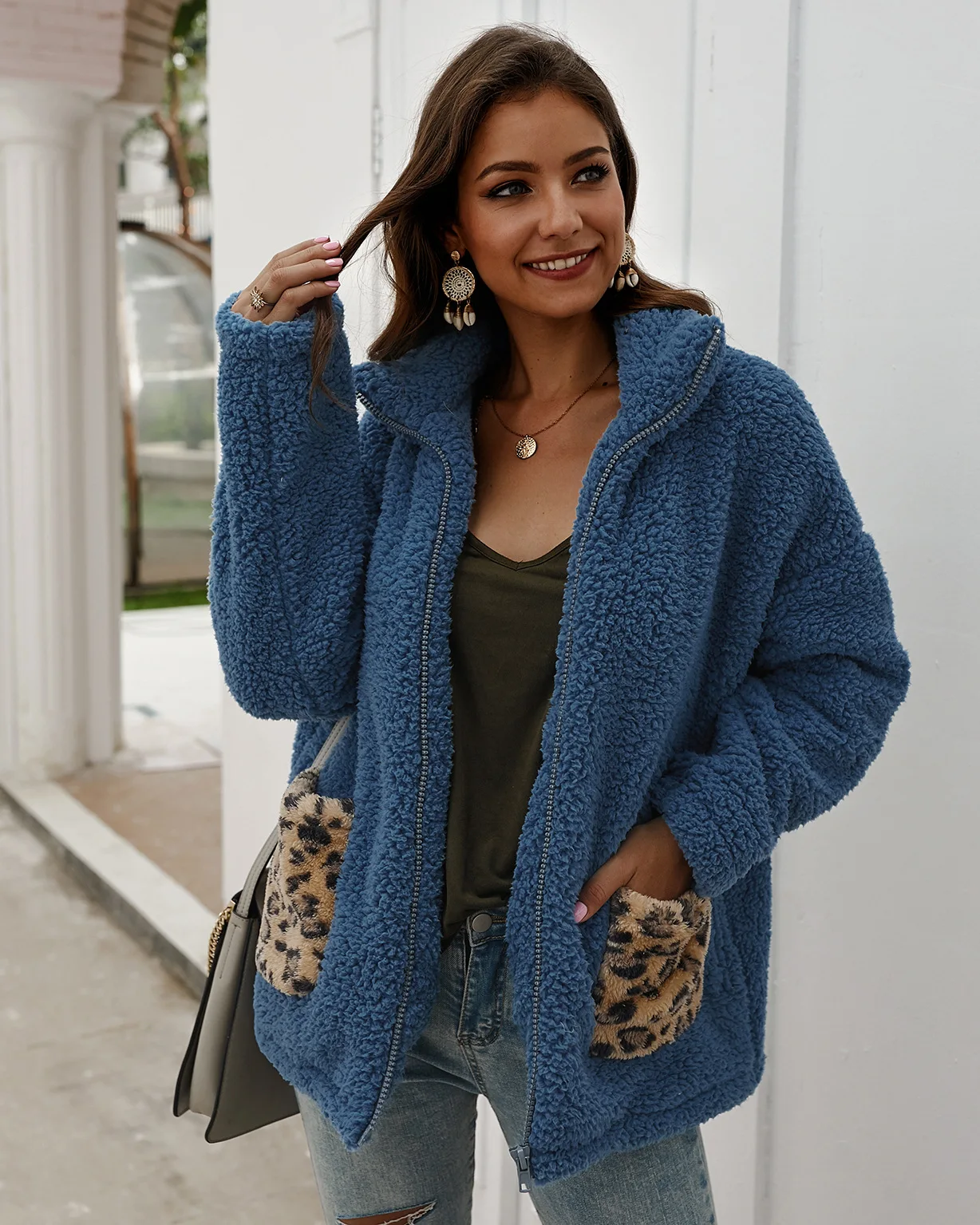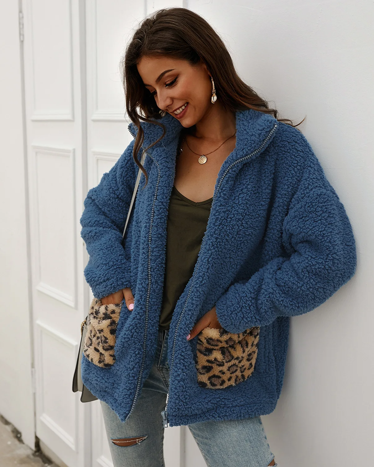 FREE SHIPPING Autumn Winter Plush Coat Casual Soft Leopard Pocket Zipper Jacket Women Cardigan Loose Outwear Ladies Warm Coats JKP2785