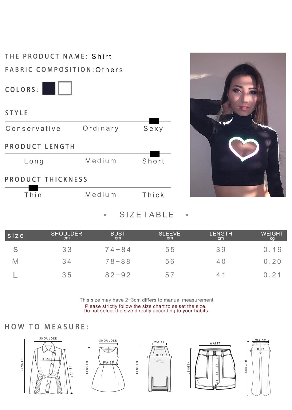 very nice. the large fit my 34 c chest well. sleeves are snug on my untoned somewhat chunky upper arms but is not uncomfortable. with arms down the heart is perfect, but taking a selfie distorts it. i love it!