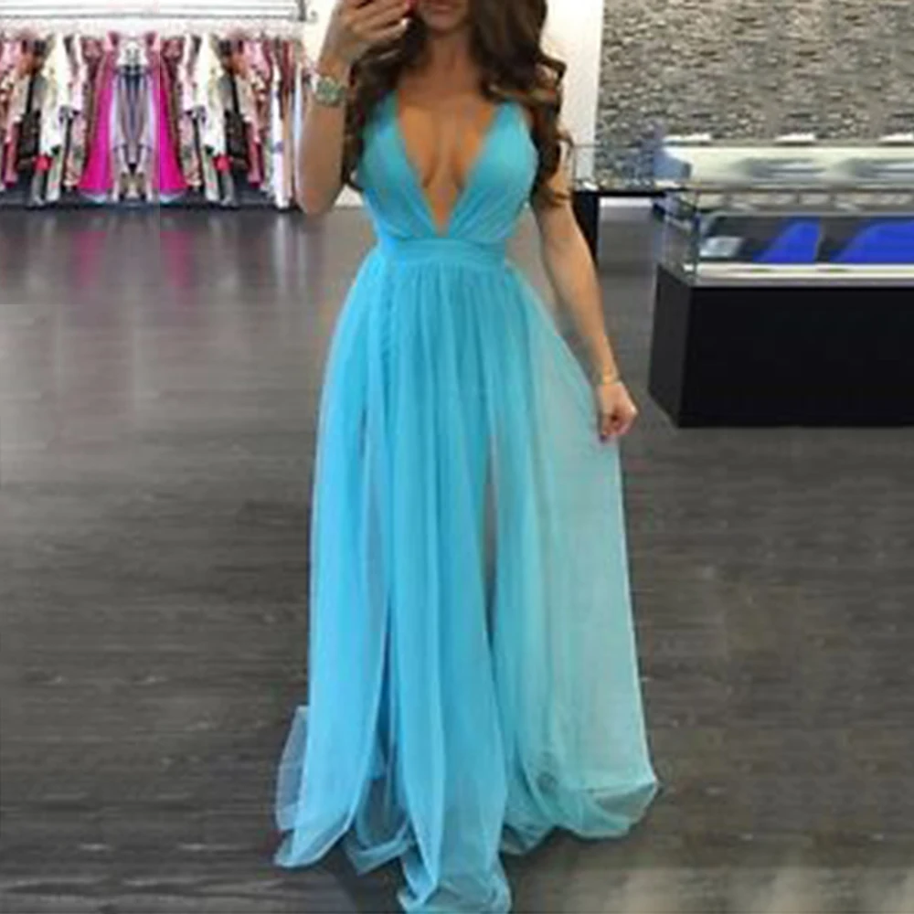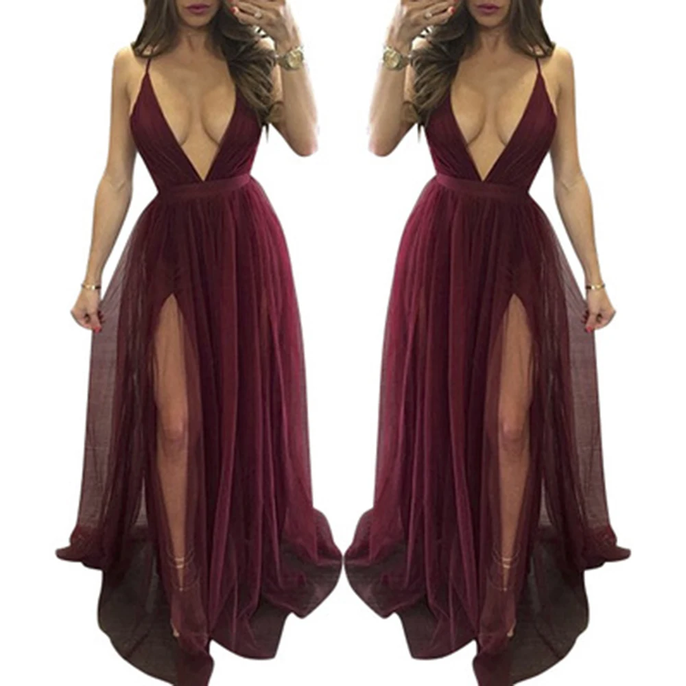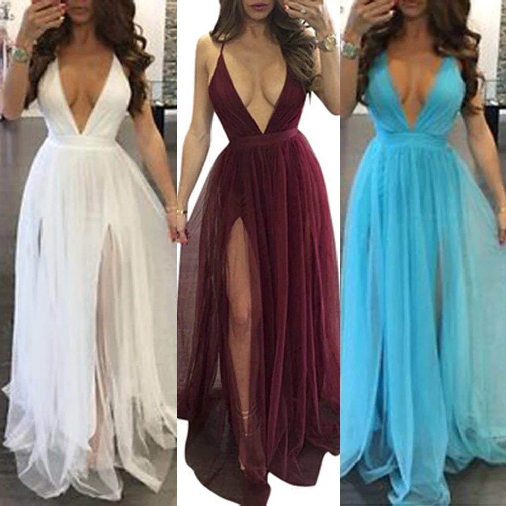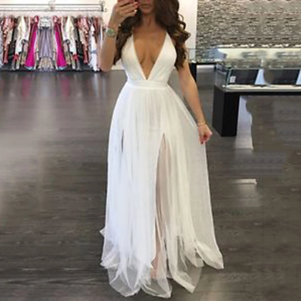 FREE SHIPPING Backless Sexy Spaghetti Strap White Split Dresses Long Maxi Mesh Party Dress JKP1074
