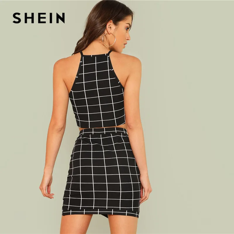 FREE SHIPPING Black and White Women Two Piece Plaid Top Skirt Set JKP517