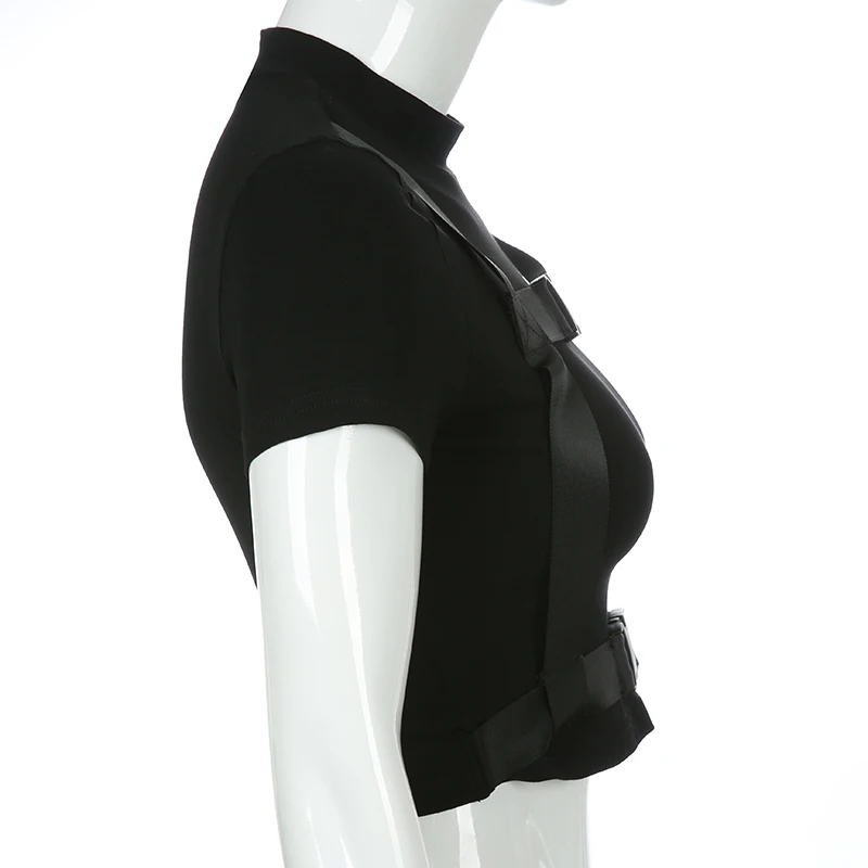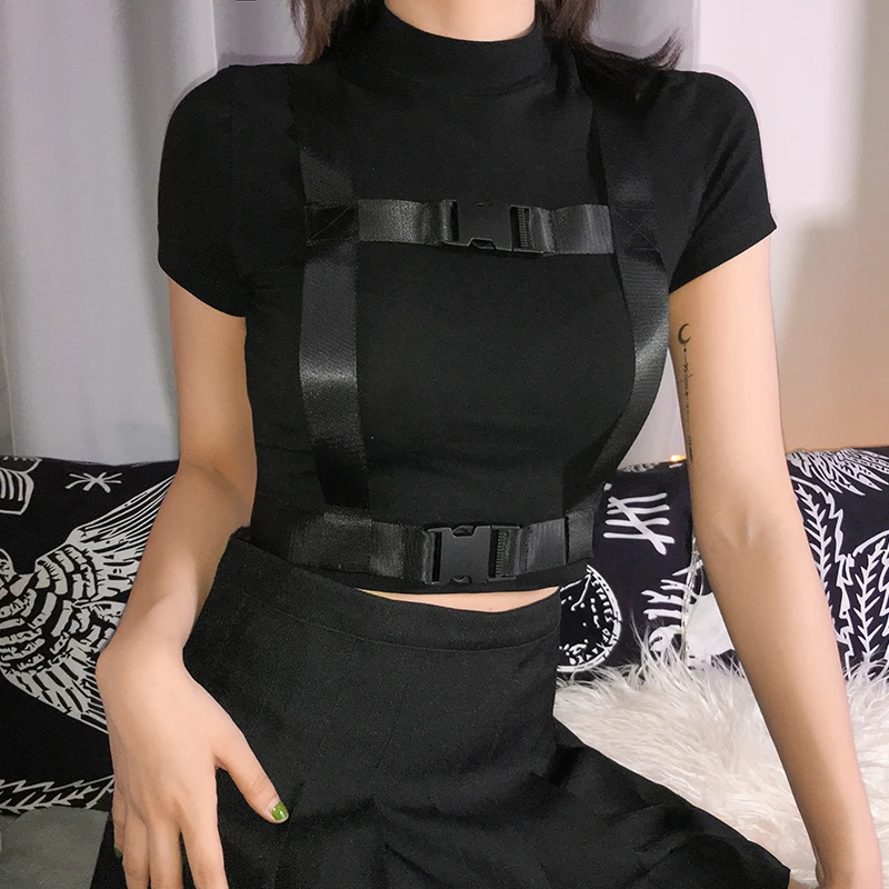 FREE SHIPPING Black Gothic Tshirt Short Sleeve With Buckle Ribbon JKP4790