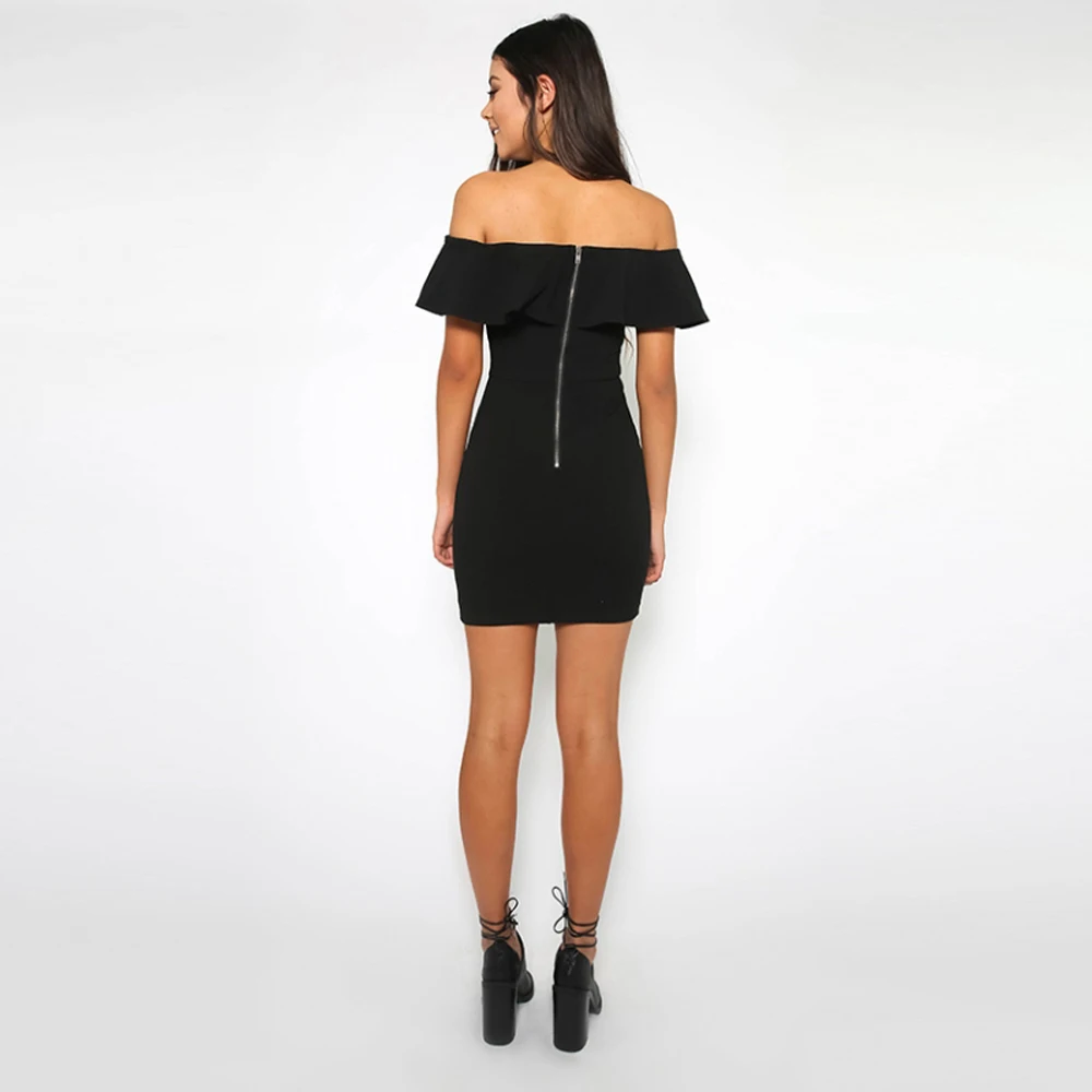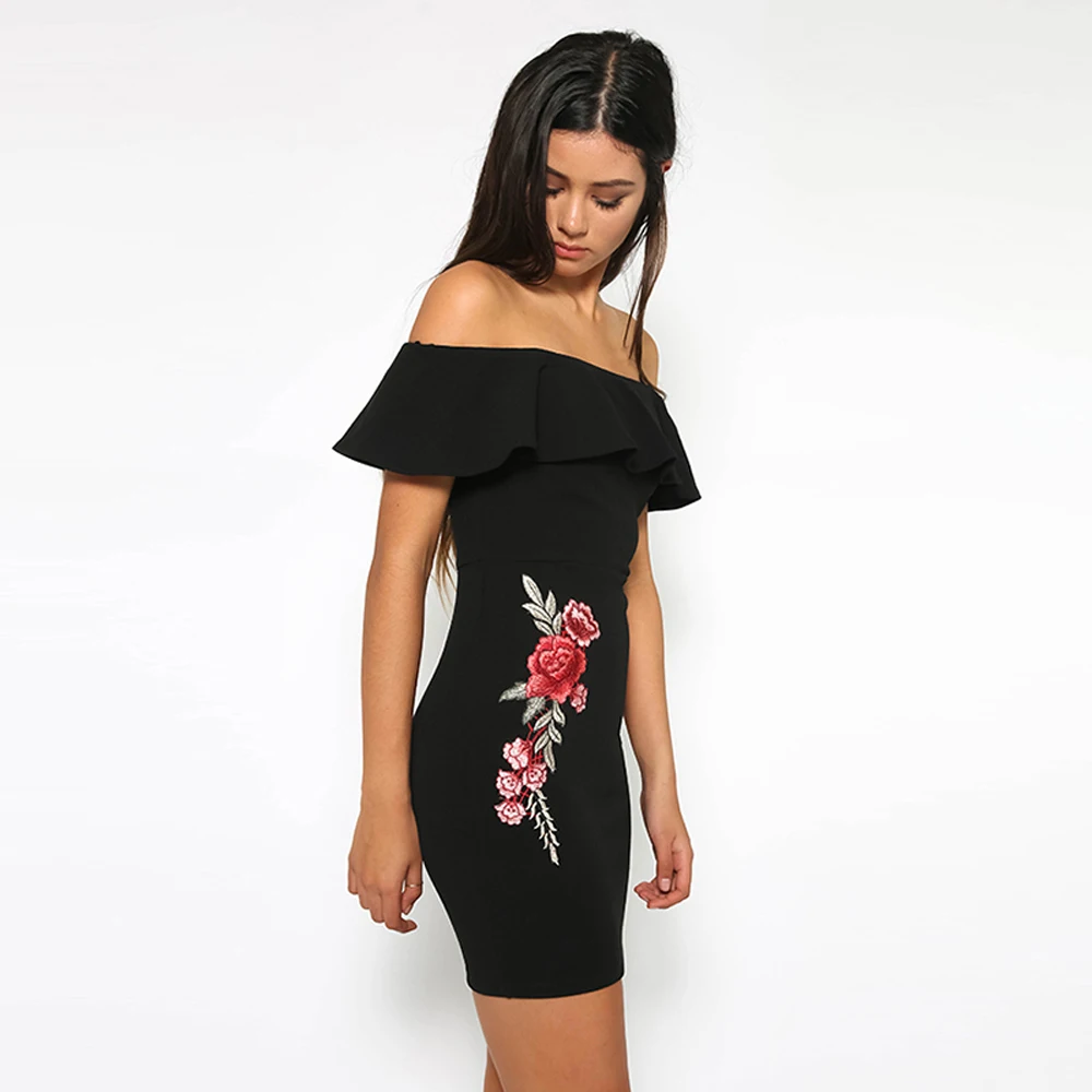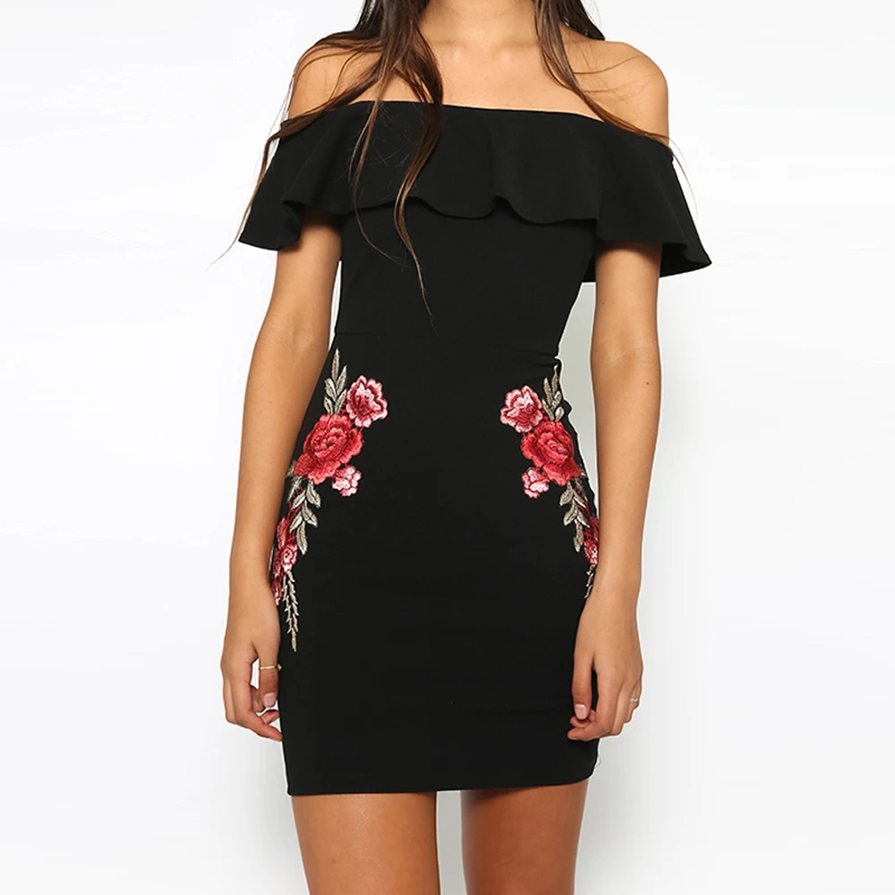 HYH HAOYIHUI Sexy Black Off Shoulder Bodycon Dress Slash Neck High Waist Rose Embroidery Frills Mini Dress Zipper Dress Vestidos