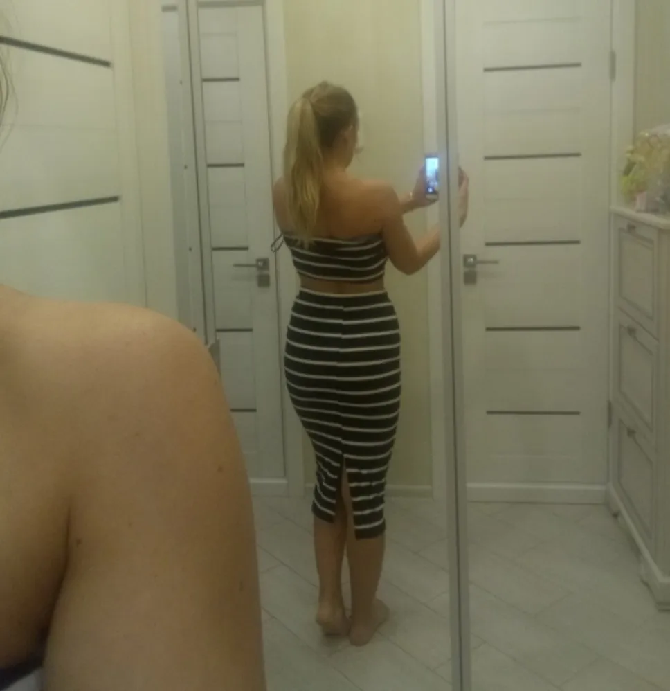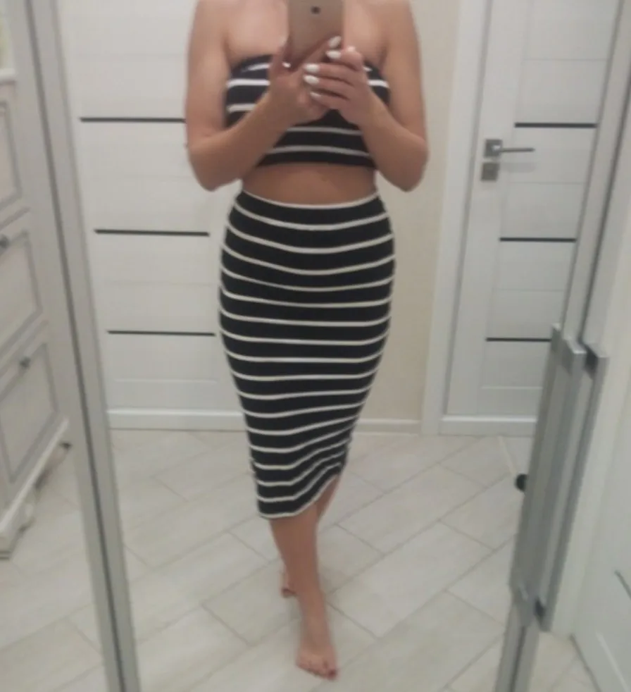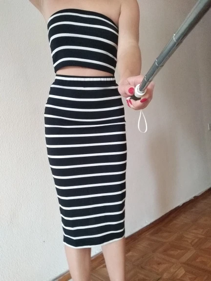 The suit is cool. Fabric cotton 95% and polyester 5%, thin, but it does not shine. In hot sunny weather it will be very comfortable. On the parameters 92-63-95 the size of m sat as it should, on the big chest probably will already be too small, as it does not stretch much. The height of 168 is ideal. There are inconsistencies of strips on the seams and in the top and in the skirt, but it will be easy to fix, it is clear that this extra time or means, nevertheless perfectionists will be able to correct it if they want. Thank you very much to the store for the promptness of sending, the delivery was also fast (before minsk for a week and a half)