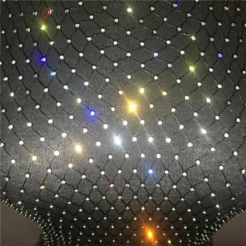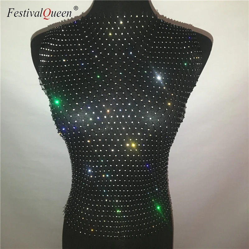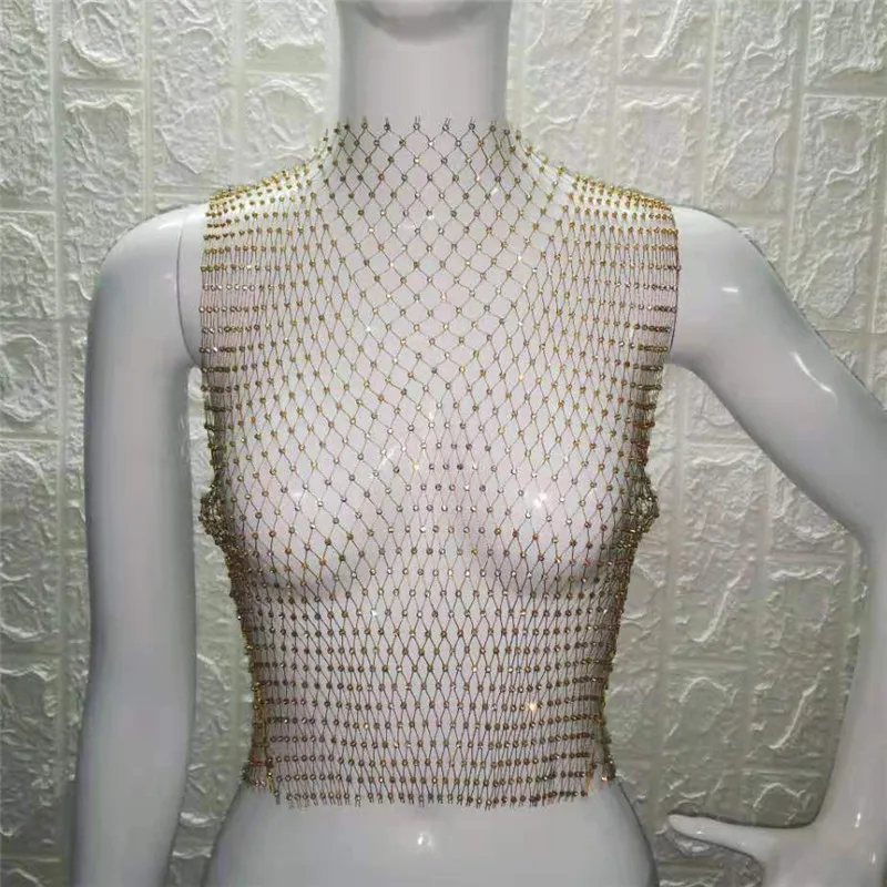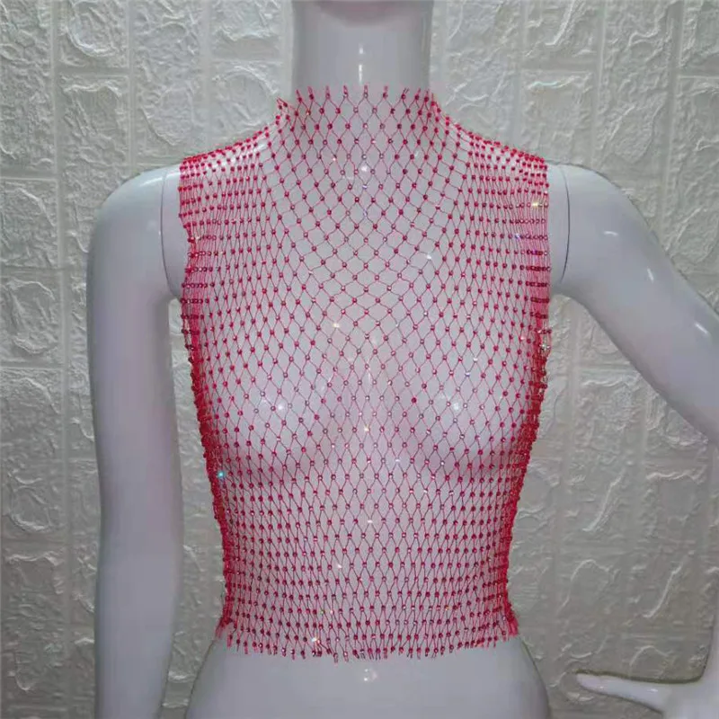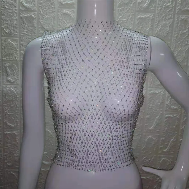 Bling Rhinestones Grid Tank Top Women Sexy See Through Sleeveless Fishnet Hollow Crop Top Summer Beach Cover Up Lady Clubwear