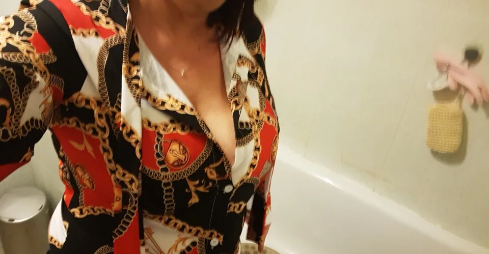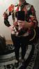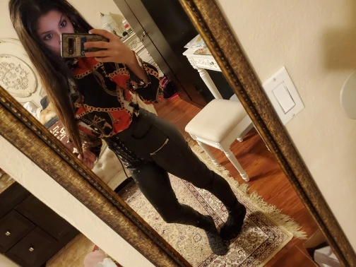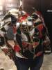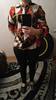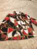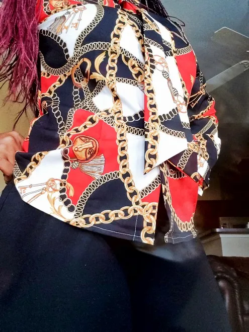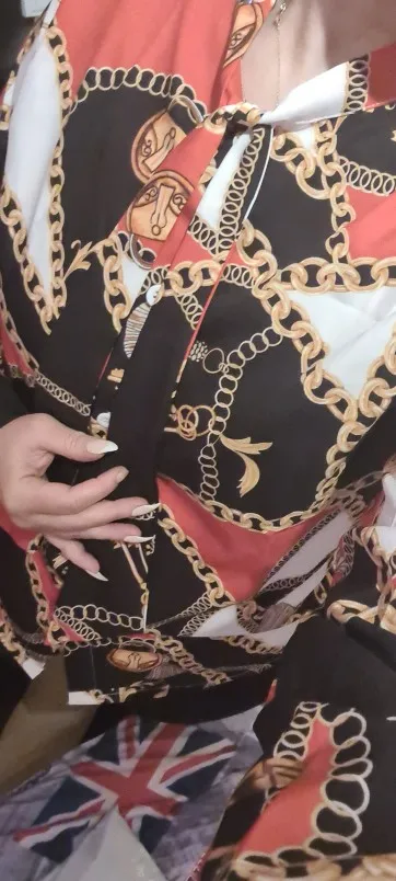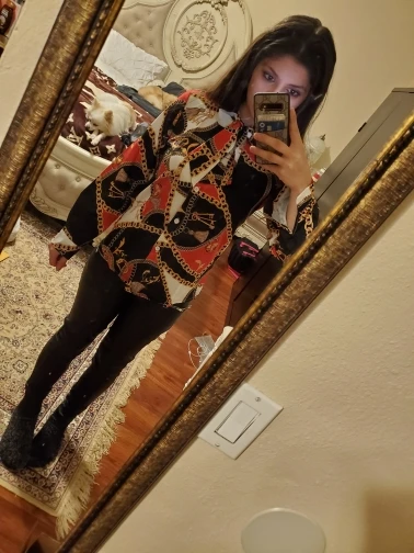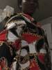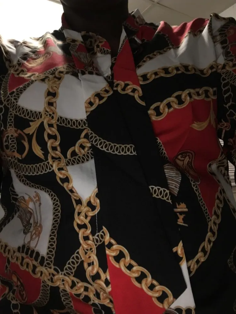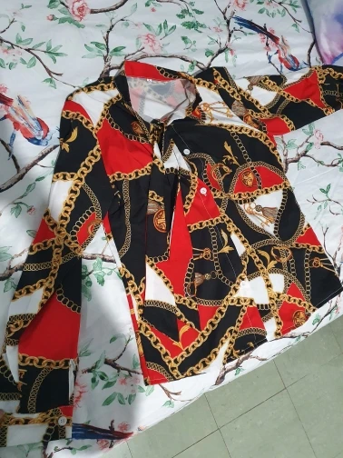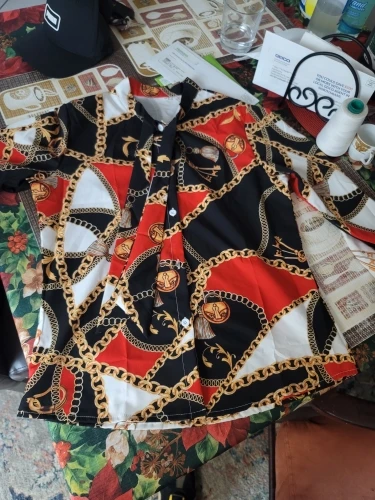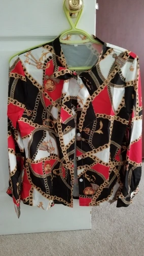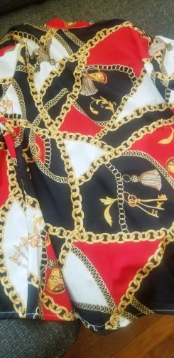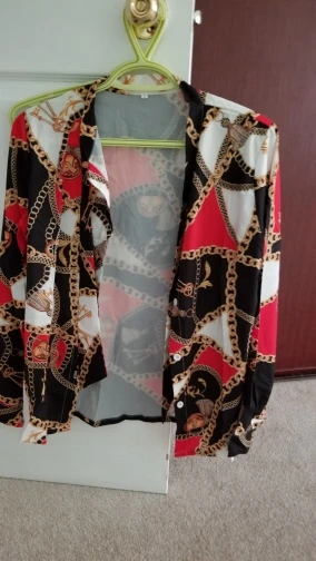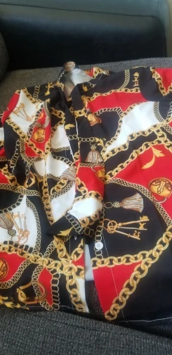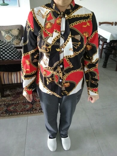 very classy rich look. I love it with the black leather pants. it looks expensive. I just hope the dyes dont leak too much when I wash it because some of the shirt is white and I fear the red and black dye may bleed. I will try cold washing by hand and air drying because I will not wear it before washing it
