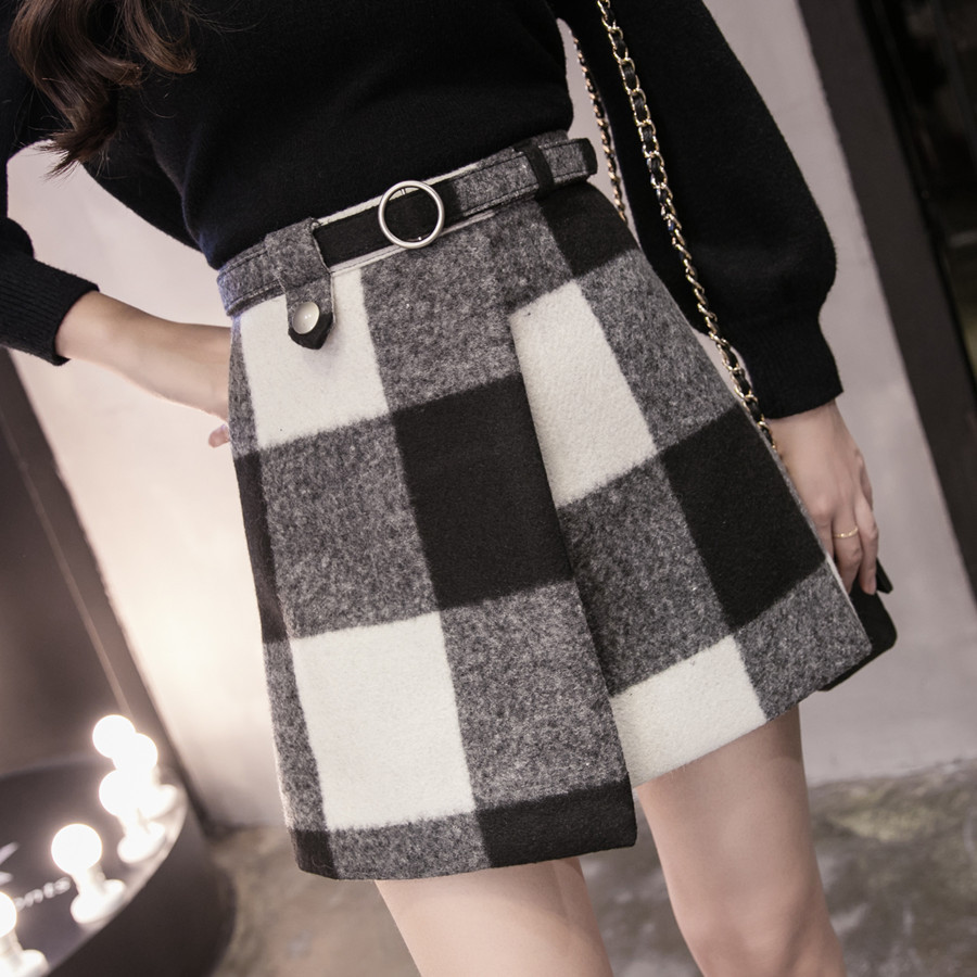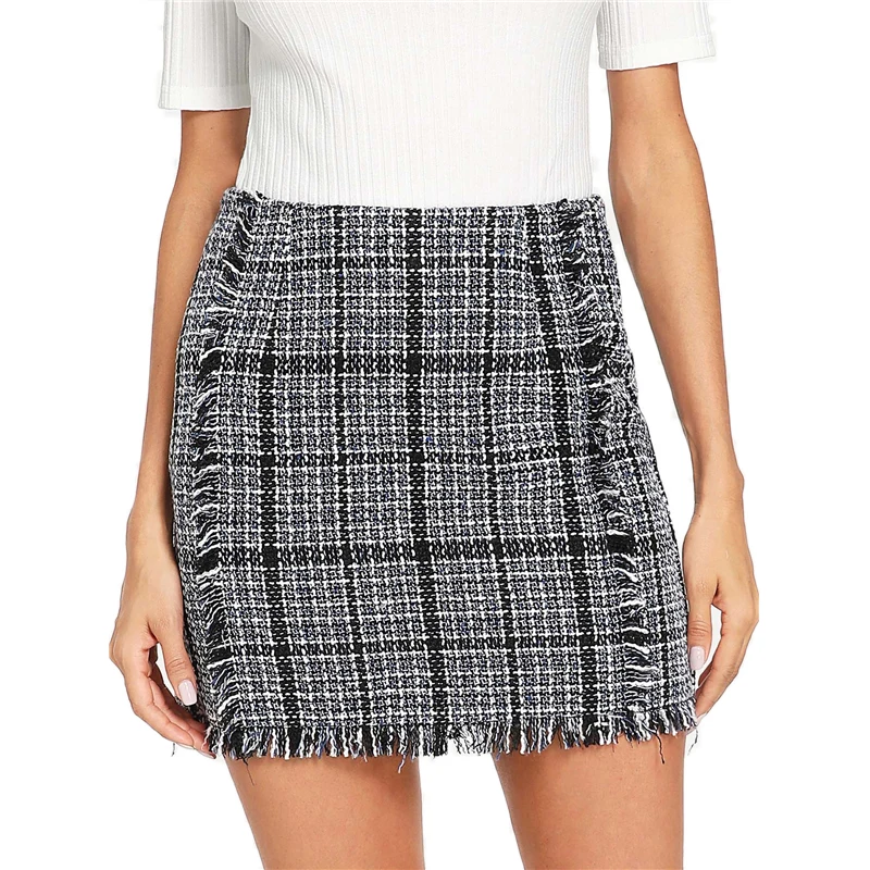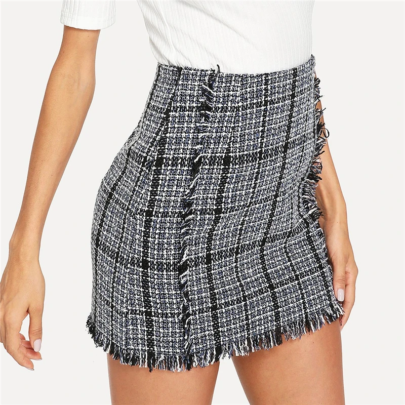 FREE SHIPPING Blue Frayed Trim Plaid Tweed Skirt JKP3453