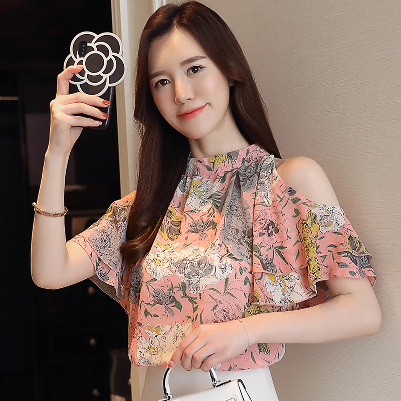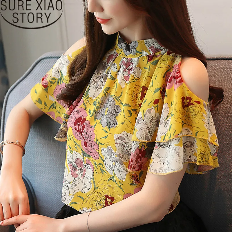 FREE SHIPPING blusas mujer de moda shirts womens tops and blouses Ruffles Short women shirts Floral Butterfly Sleeve Stand JKP2740