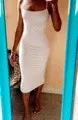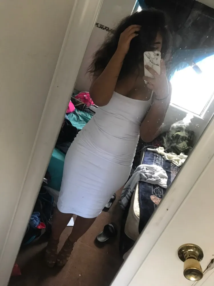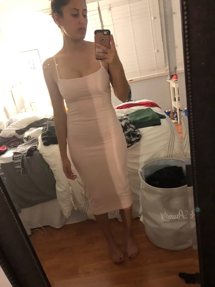 I’m sorry for messy background so I love this dress! Doubt white and don’t see through! I wear medium size but it is too small for me to fit because I might be thick slim... little sketchy... other strap was broken and I sew it. Thank you for delivering before Christmas because I needed it to wear white dress for taking pictures with the family.