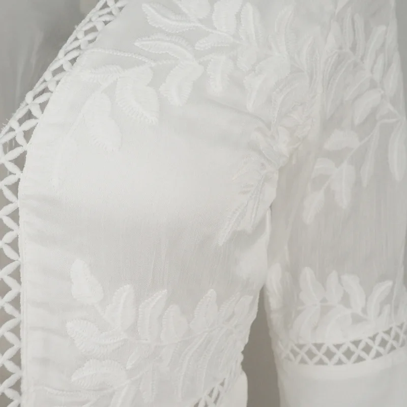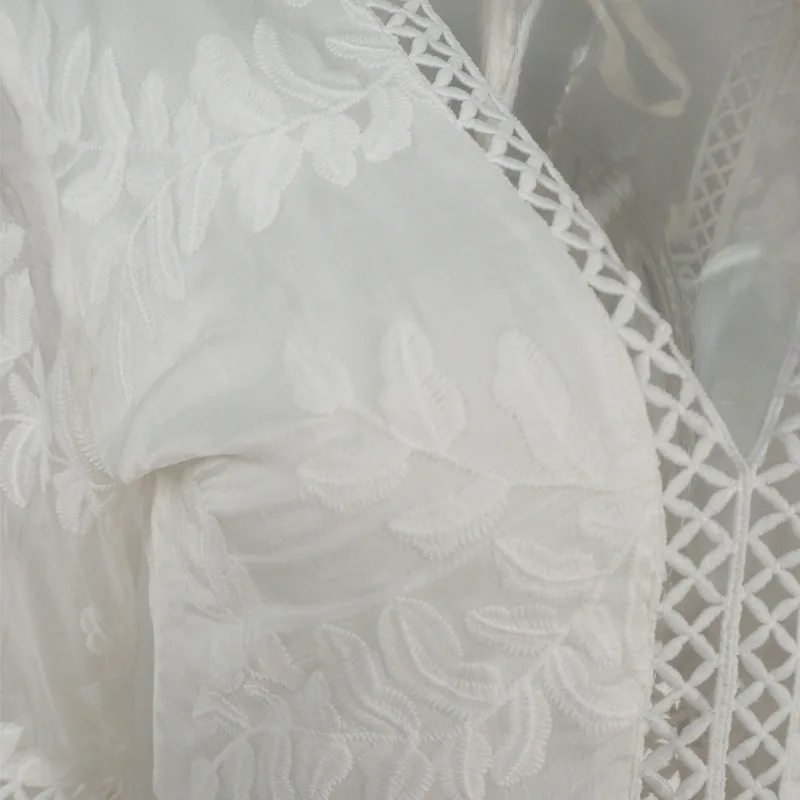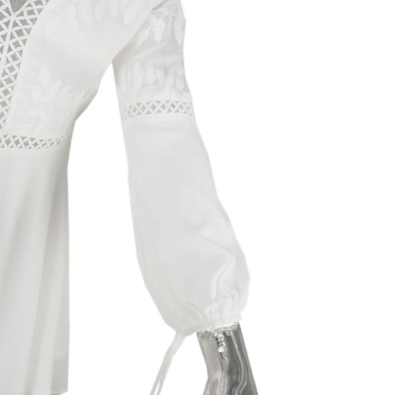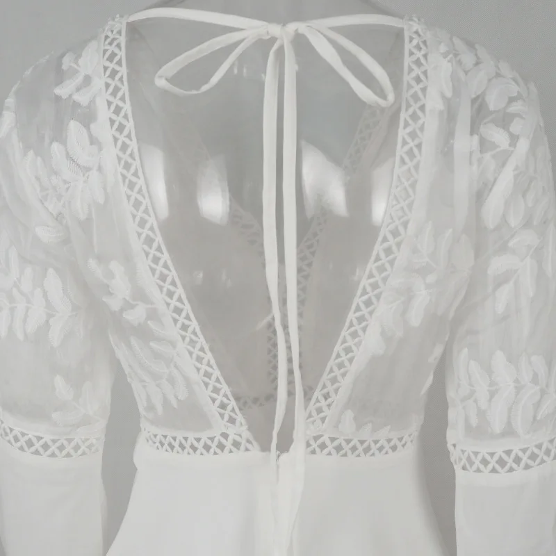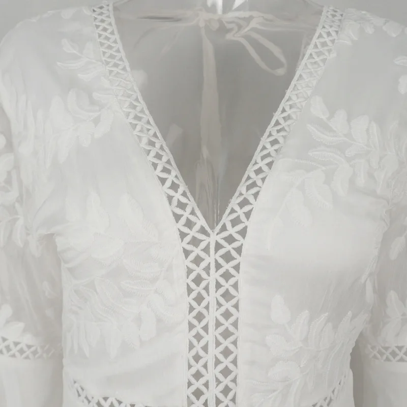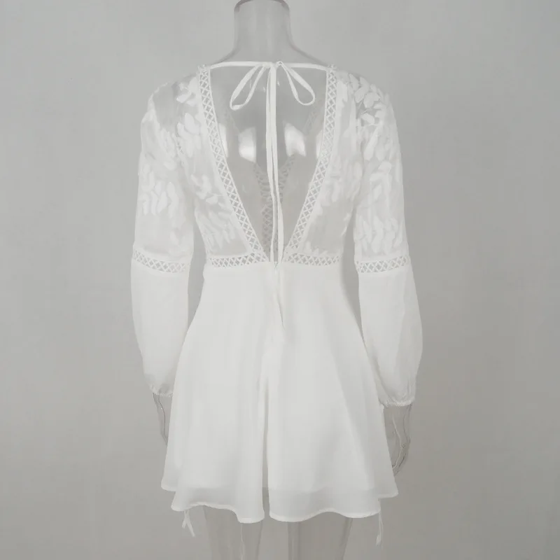 FREE SHIPPING Bohemian Boho Beach Dress Summer Women Hollow Out Crochet Lace Chiffon Dress White V Neck Long Sleeve Backless Mini Sexy Dress JKP1824
