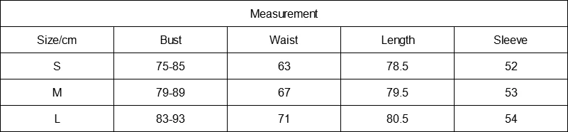 SizeChest Width(cm)Waist Width(cm)Sleeve Length(cm)Skirt length(cm)