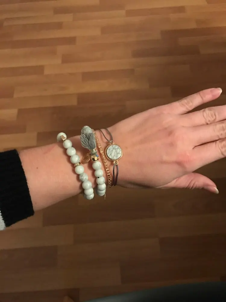 Spalvos šiek tiek pablukusios, bet šiaip viskas gražu. Akmenukų apyrankė, Gal kiek trumpoka, Mano 16 cm rankai, tiko puikiai, bet Jau Tik tik.