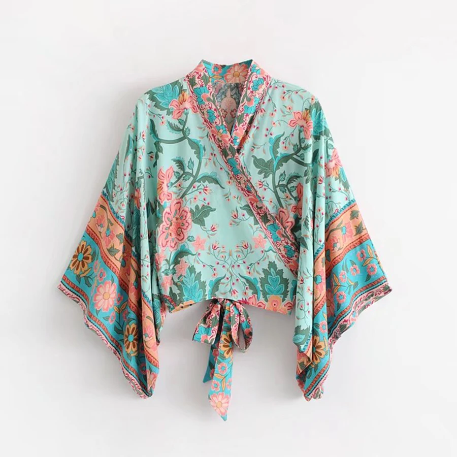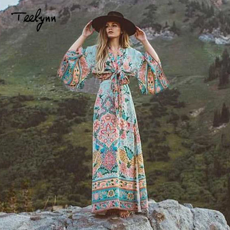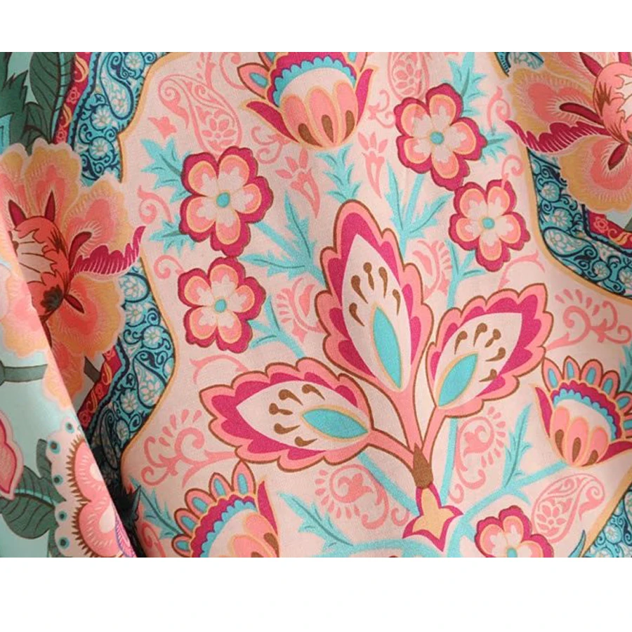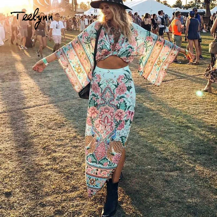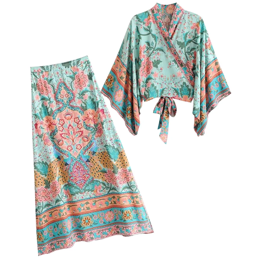 FREE SHIPPING Boho 2 Piece Women Set Kimono Top And Maxi Skirt In Peacock Floral Print Kimono sleeves Wrap tie 2018 hippie chic Bohemia set JKP1672