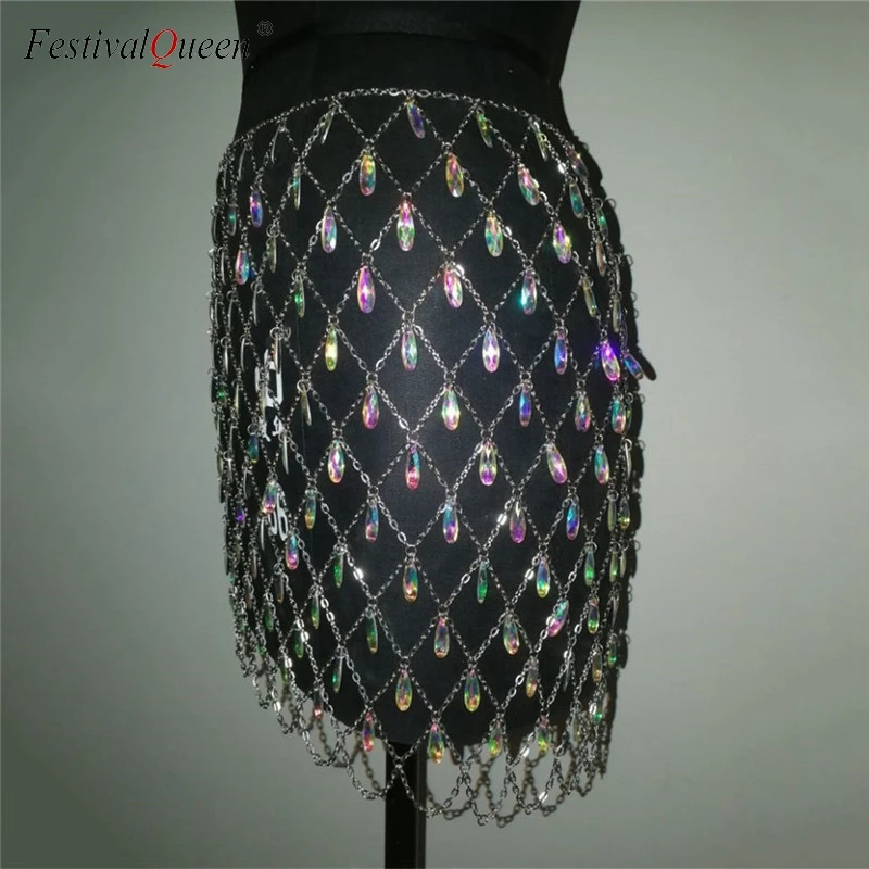 FREE SHIPPING boho crystal sequin women’s metal chain skirt summer beach hollow out sparkly handmade mini skirts JKP2911