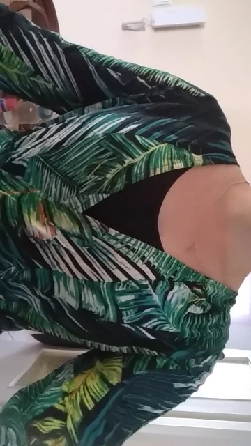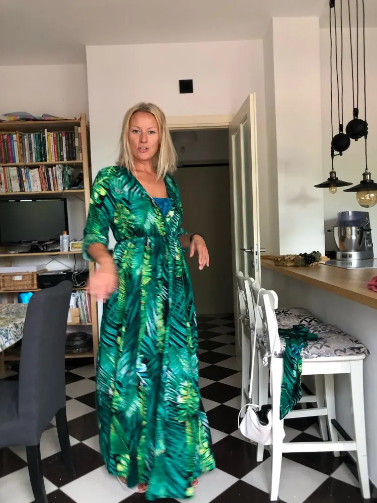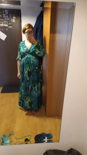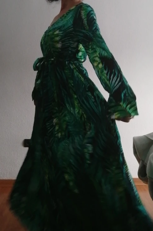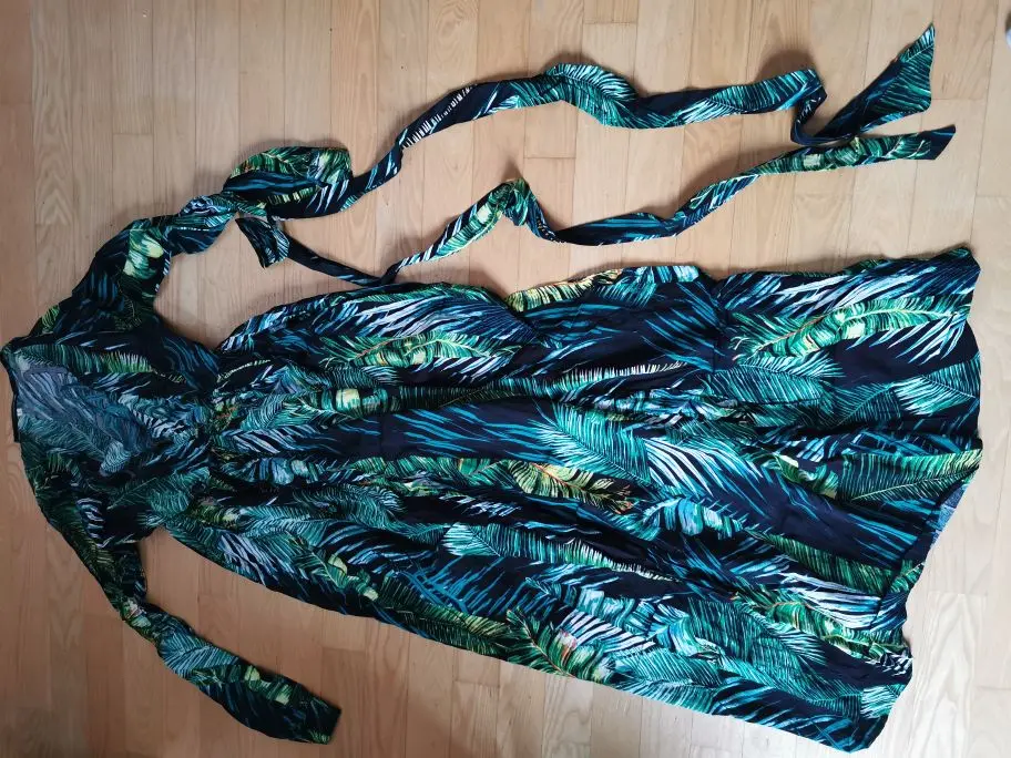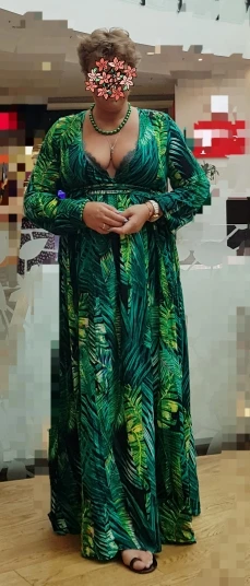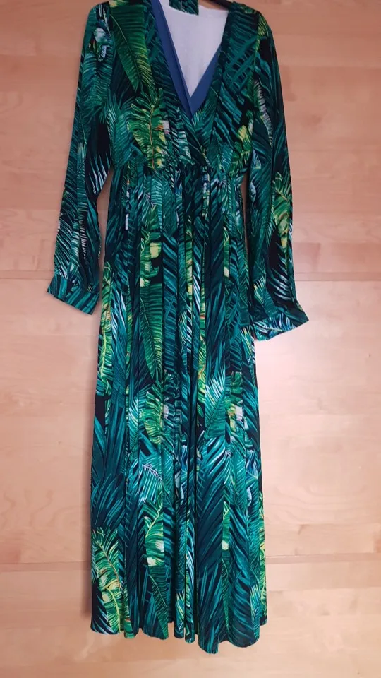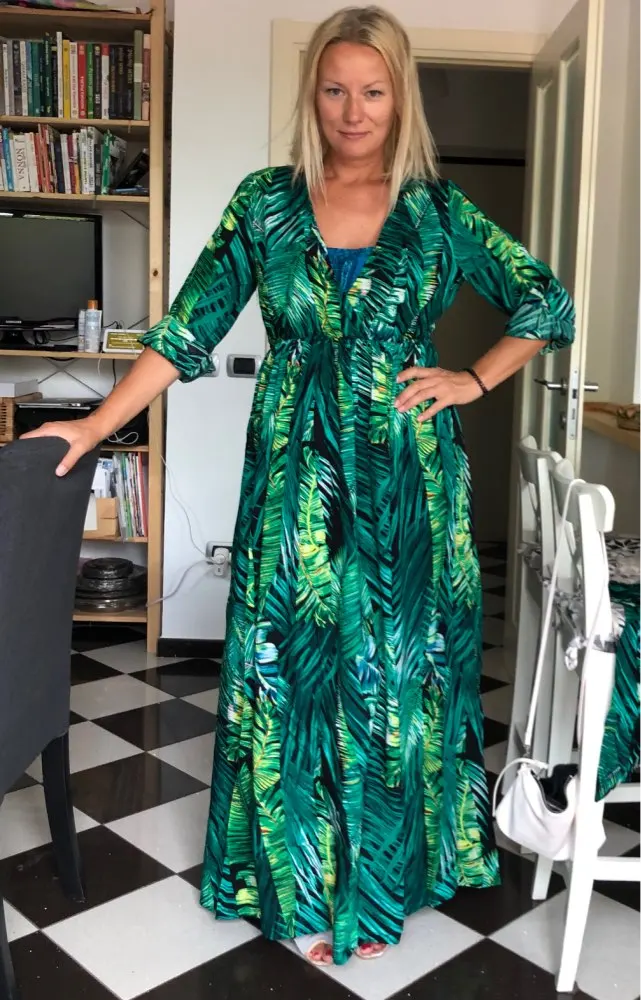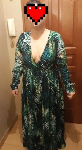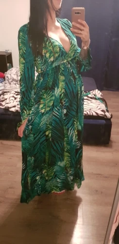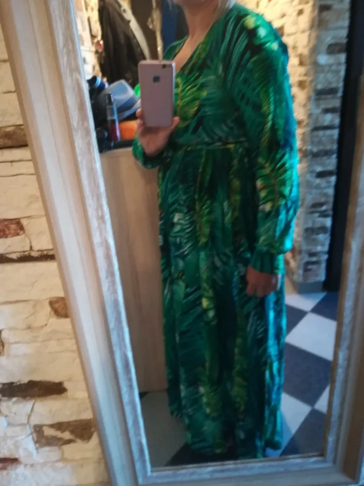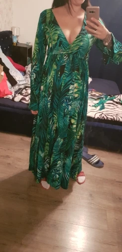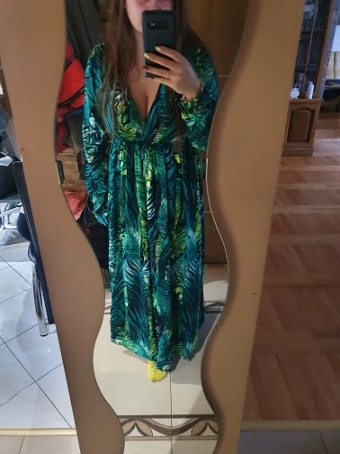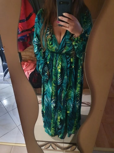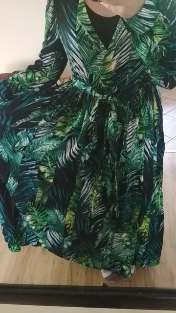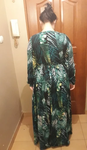 piękna.. wzięłam rozmiar XXL na 106 w biuście i musiałaby być większa ... na szczęście pasek jest długi i mogę podszyć nim dekolt. długość na 170 cm wzrostu jest idealna. piękne soczyste odcienie zieleni, materiał lejący się i jest go naprawdę dużo. daję 100/10
