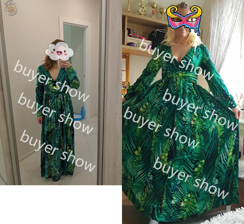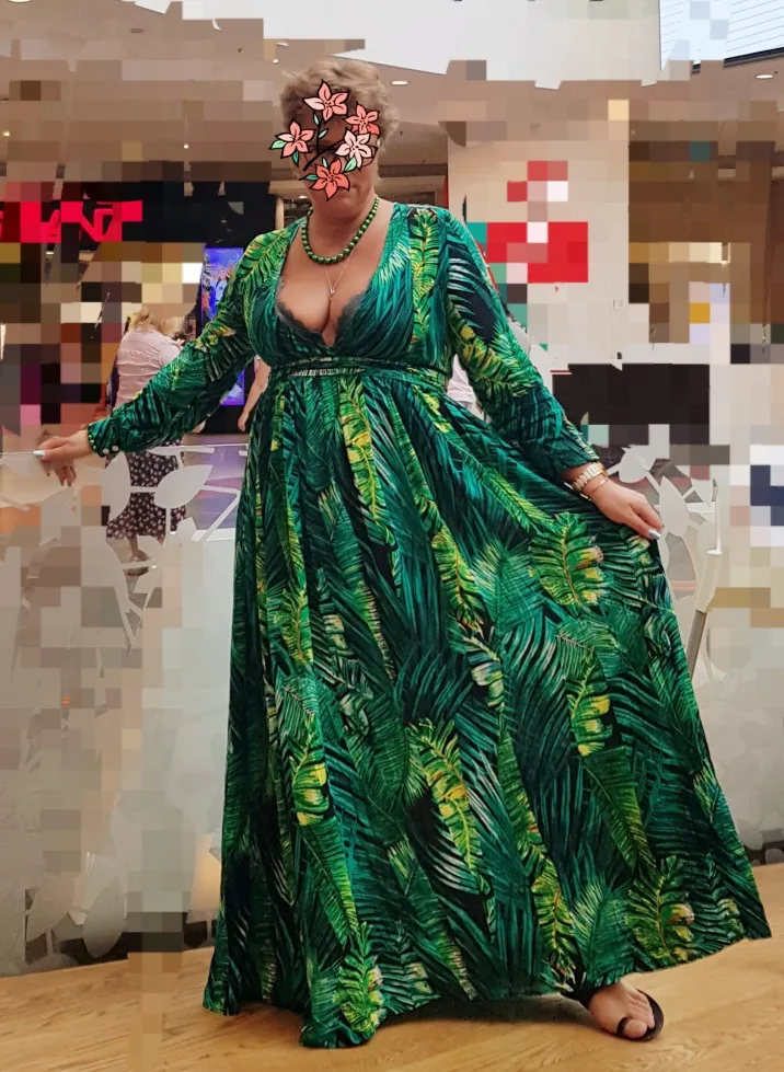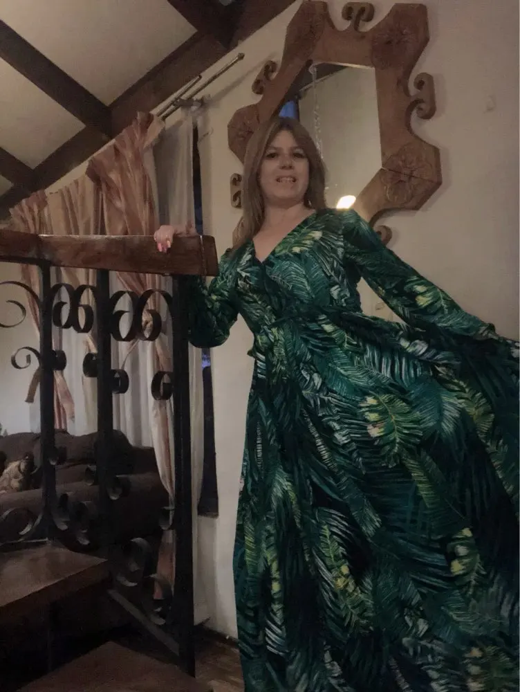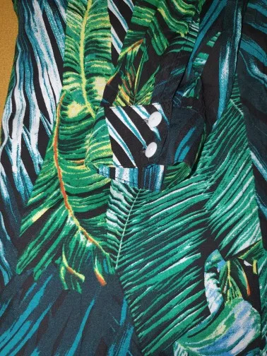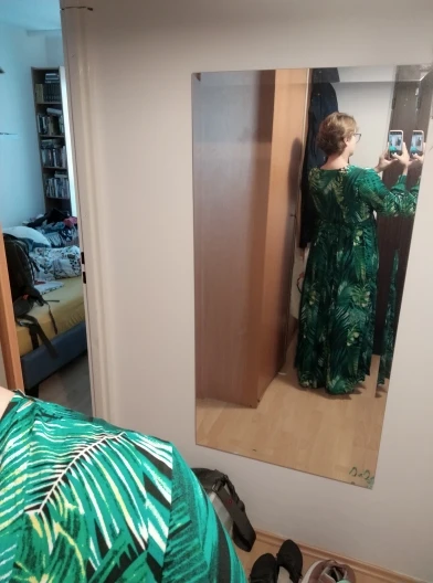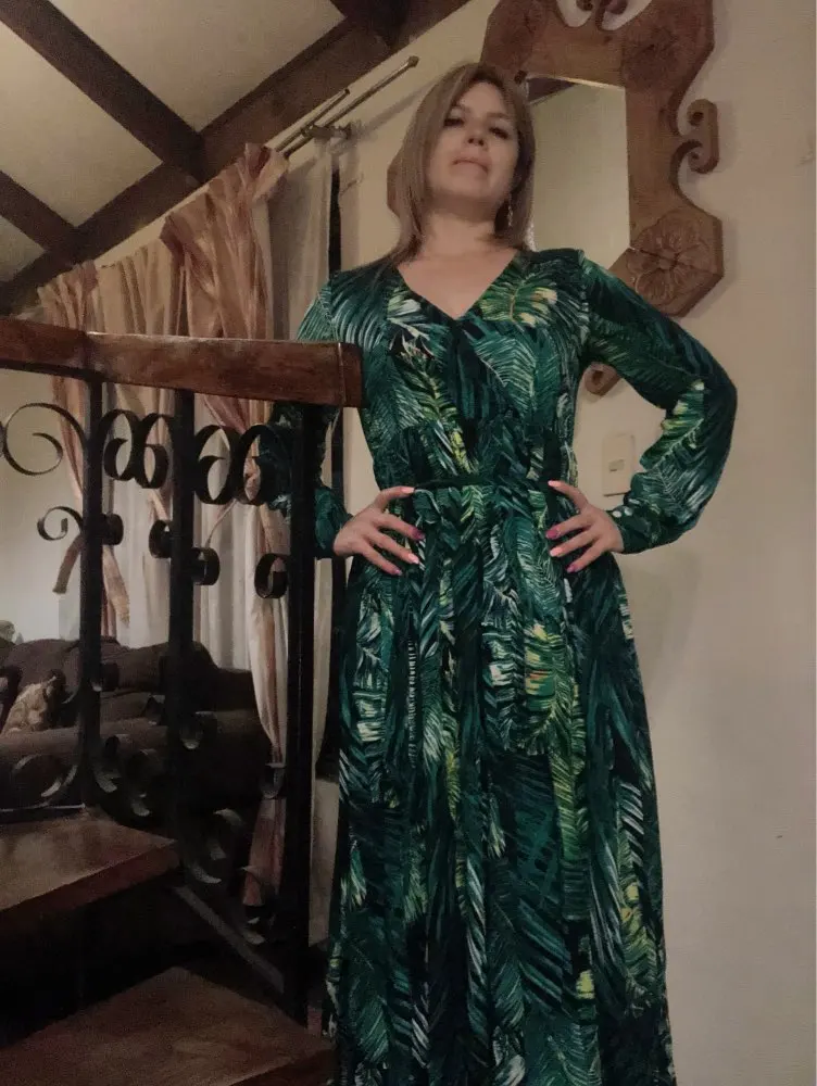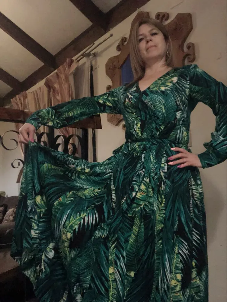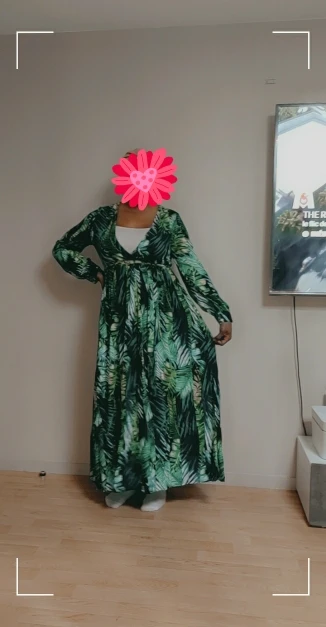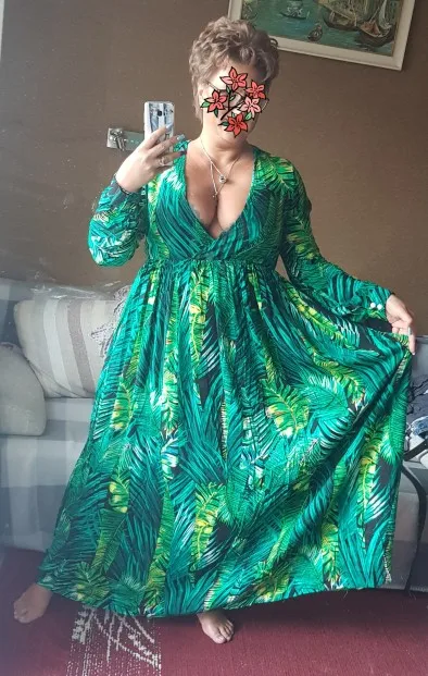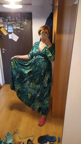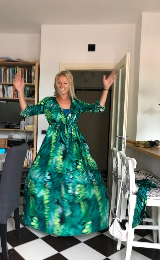 piękna.. wzięłam rozmiar XXL na 106 w biuście i musiałaby być większa ... na szczęście pasek jest długi i mogę podszyć nim dekolt. długość na 170 cm wzrostu jest idealna. piękne soczyste odcienie zieleni, materiał lejący się i jest go naprawdę dużo. daję 100/10