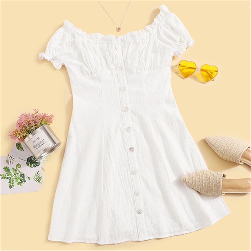 FREE SHIPPING Button Front Puff Sleeve Bardot Off the Shoulder Dress Women Summer High Waist A Line Casual Bohemian Dresses JKP2517