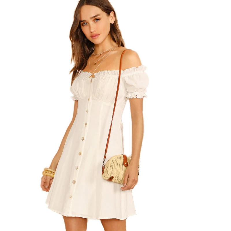 FREE SHIPPING Button Front Puff Sleeve Bardot Off the Shoulder Dress Women Summer High Waist A Line Casual Bohemian Dresses JKP2517