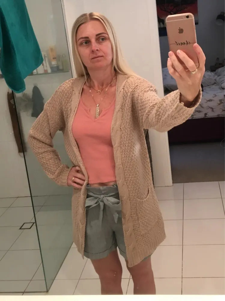 Nice cardigan warm. Fast shipping. Size corresponds to. My height is 164 cm, chest and hips 95 cm size "M" sat perfectly. True on my tummy pregnant yet does not fit, but it's nothing :-) thank you. Recommend product.