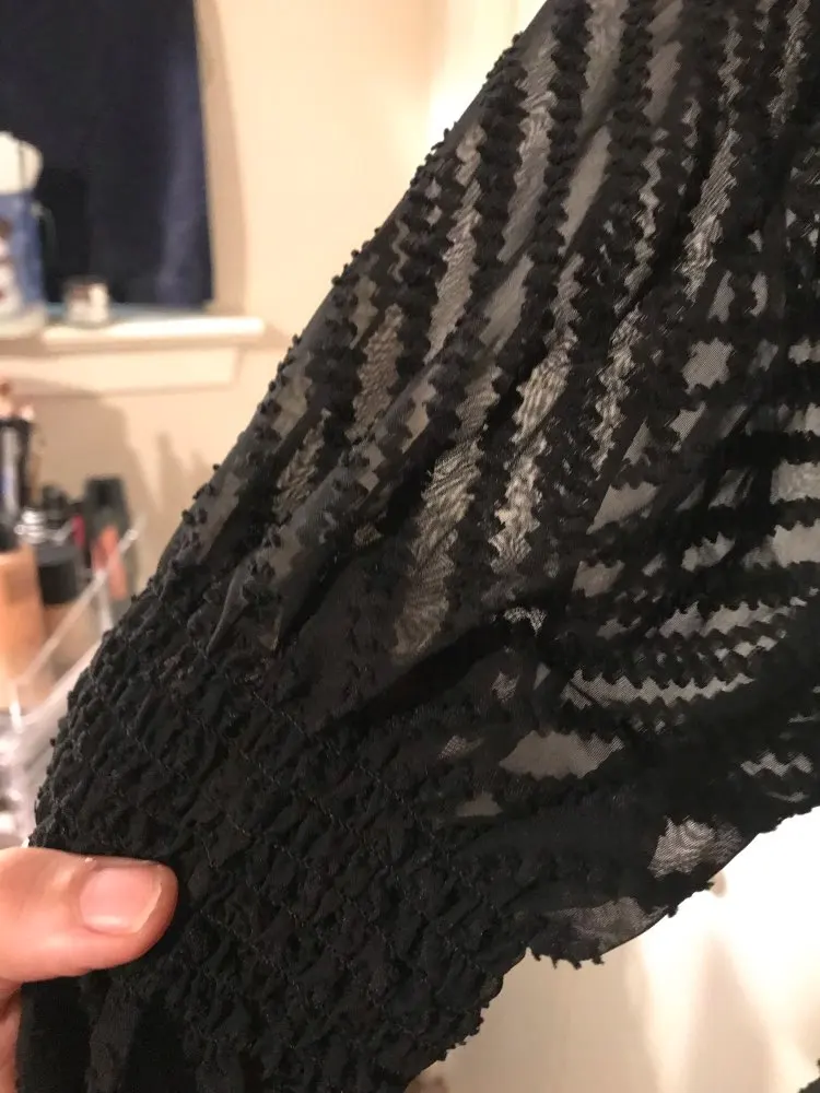 Super. M atitinka lietuvušką S. Turi pasijonį bet vis tiek permatoma IR viršui IR apačioj. Maunasi per galvą. Šiaip labai puošni. M pirkau dukrai 47 svorio IR 152 ūgio. Jai tiko.