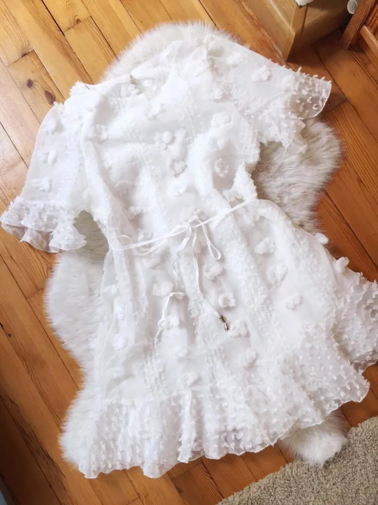 Nice dress, looks like the photos. A little bit short and i’m curious if the white fluffy dots will survive washing..