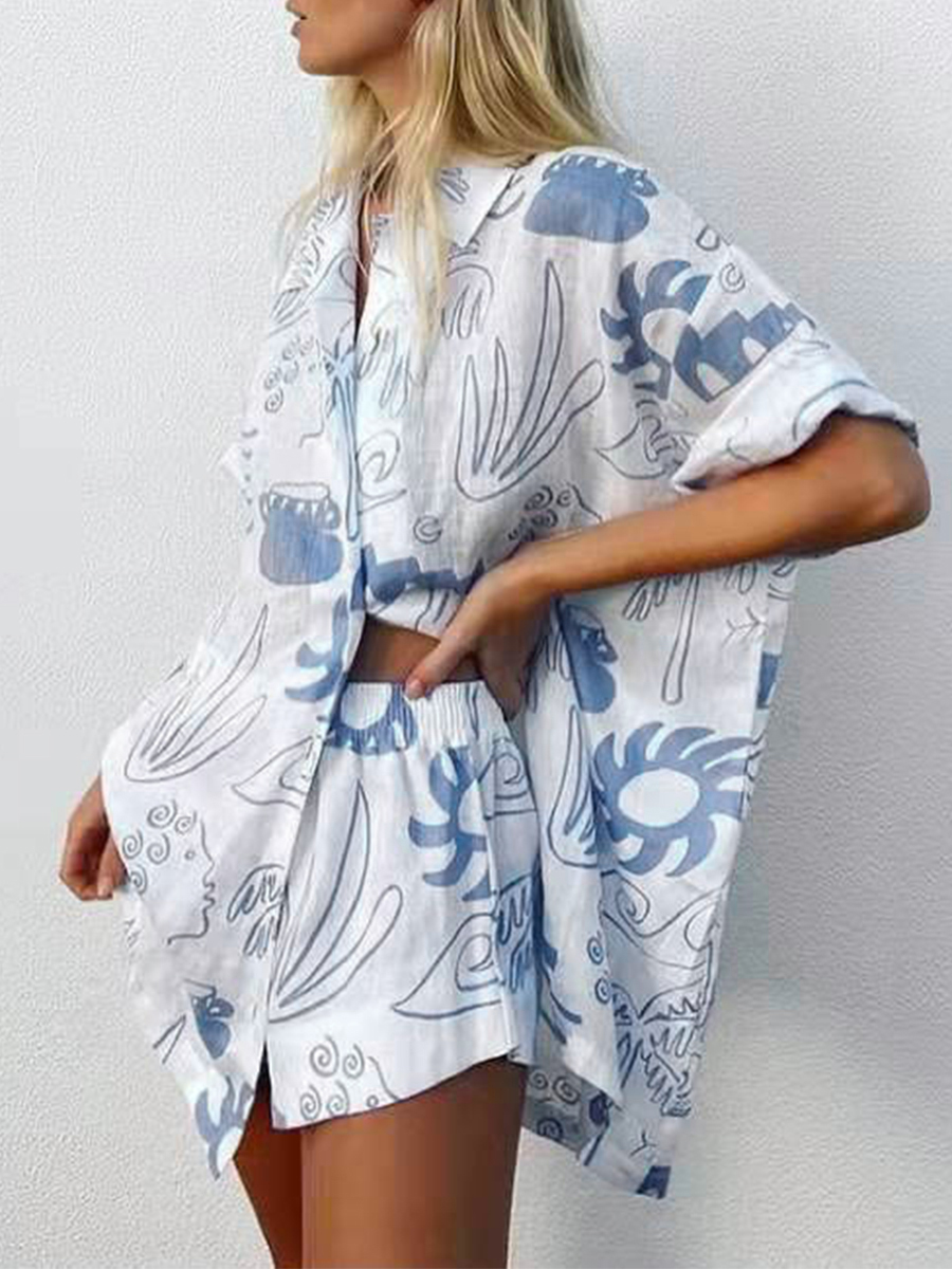 Free Shipping Casual Women’s Printed Top And Elastic Waist Shorts Set JKP7212