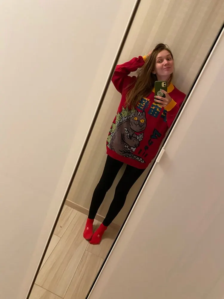 Very beautiful and pleasant to the body, to my height 166 cm sleeves oversize, cute print, everyone is happy