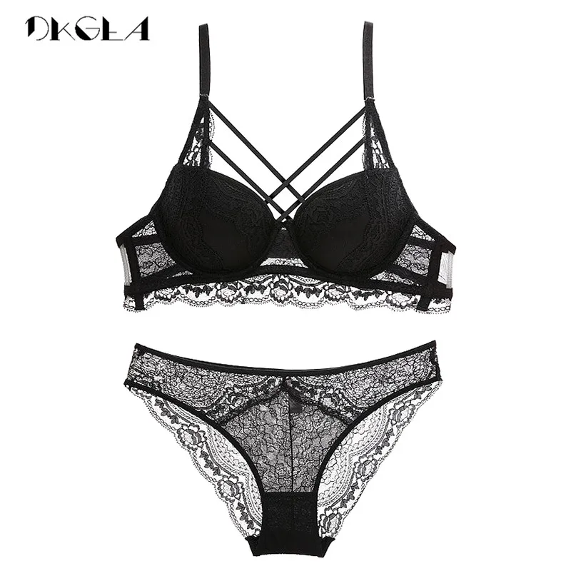 FREE SHIPPING Classic Bandage Black Bra Set Push Up Brassiere Thick Cotton Underwear Set Sexy Bras Lace Embroidery Gather Women Lingerie Sets JKP2706