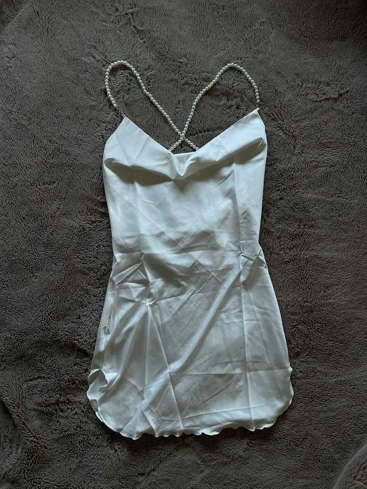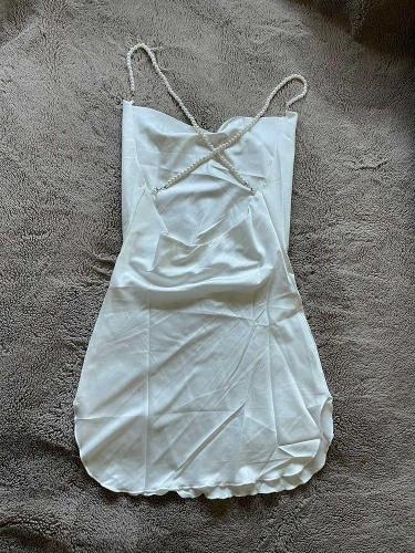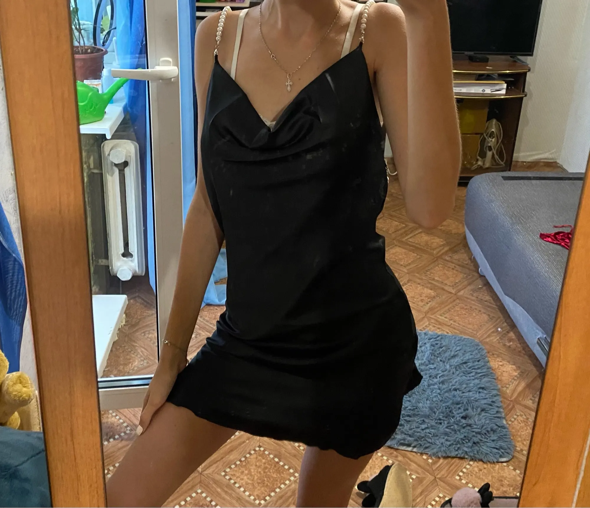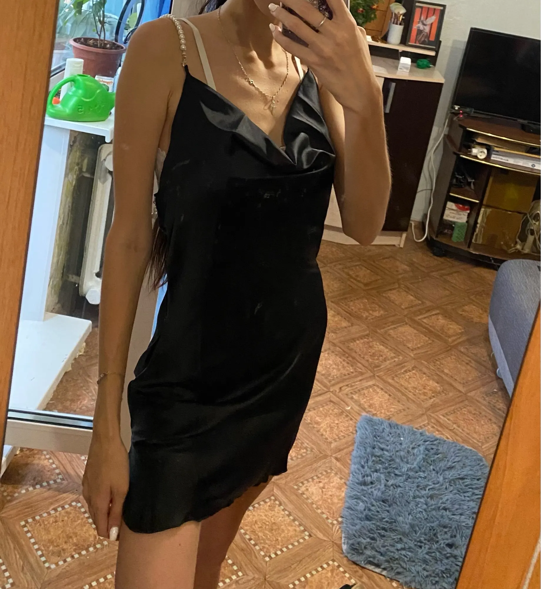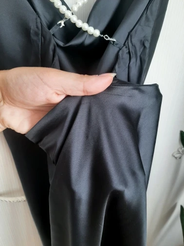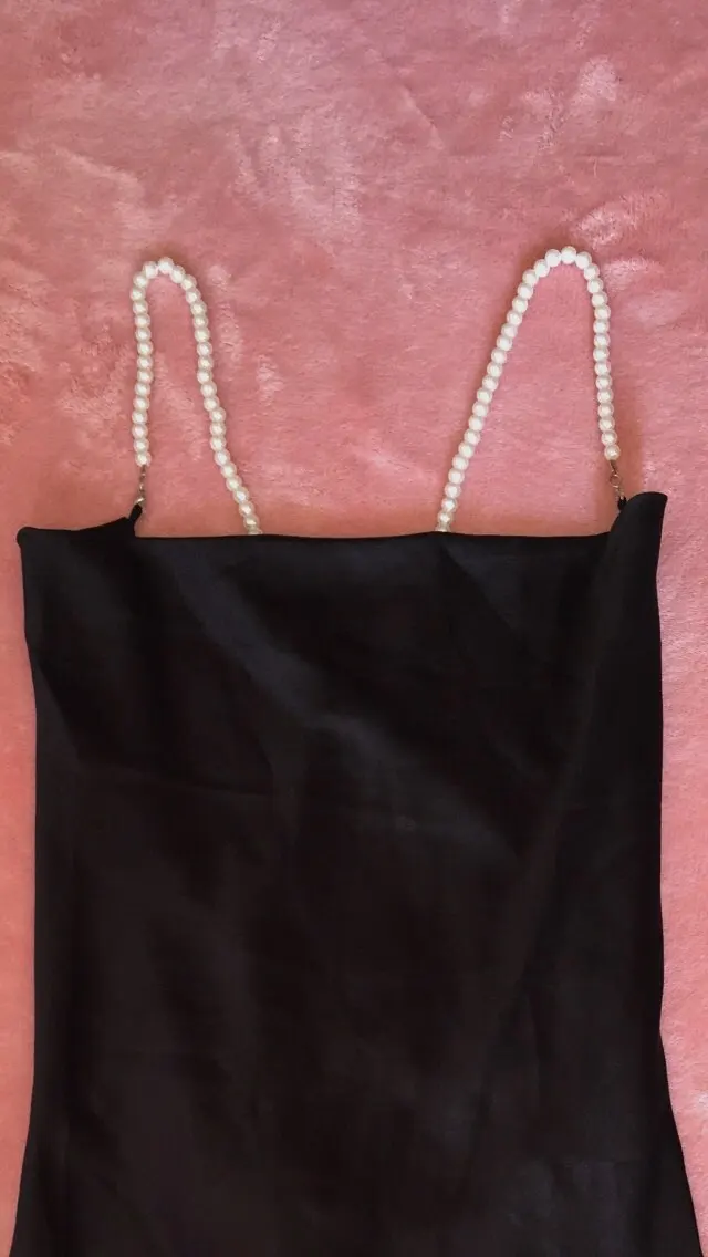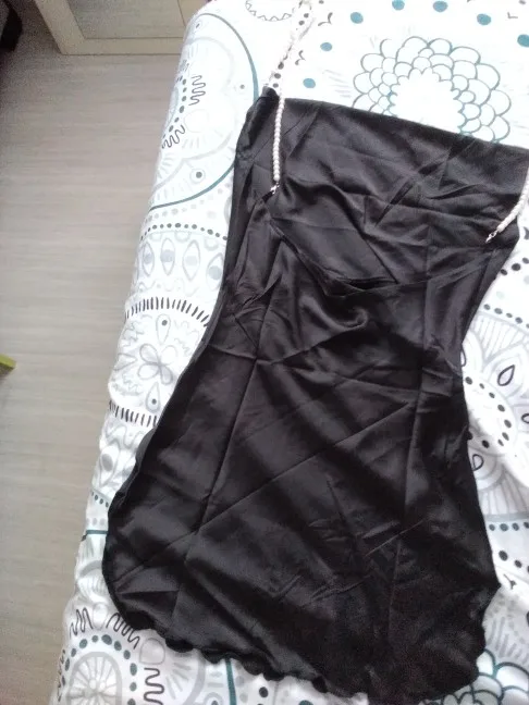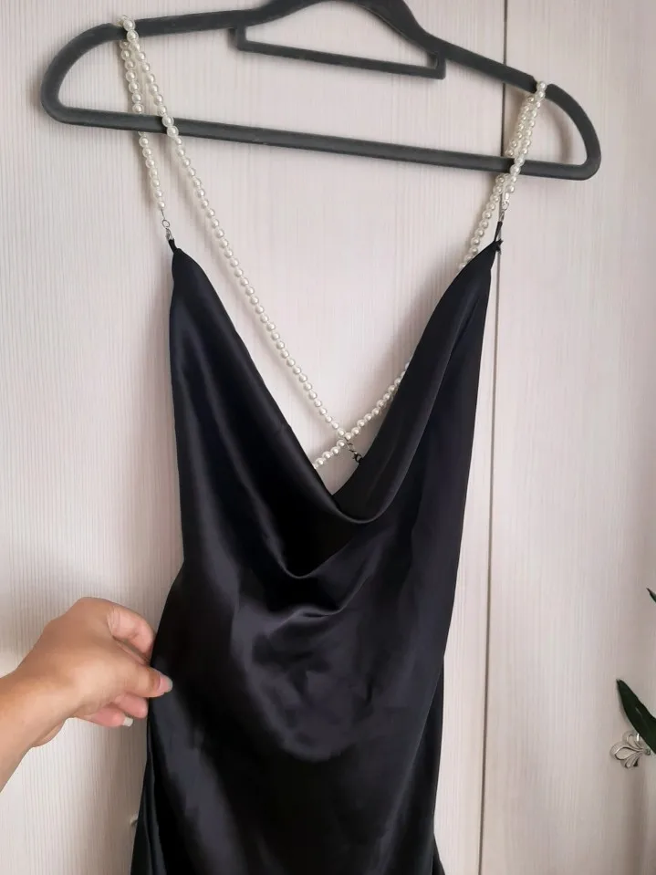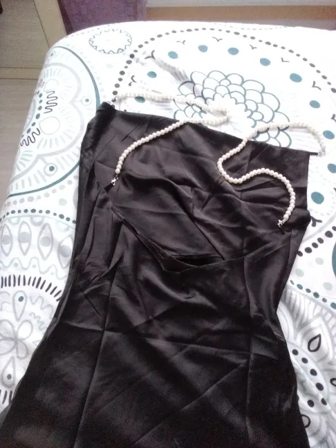 У продавца данное платье предоставлено в трех цветах, но я,выбрала чёрное и размер S. Мои параметры 88-68-92 рост 158см. Заказ в Беларусь прибыл за один месяц. Платье отличное ,на ощупь как атлас.Состав ткани полиэстер и хлопок. Платье само простое, его украшают шлейки в виде жемчуга и очень красивые вырезы . Шлейки можно снять ,легко застегиваются. По бокам два выреза, открытая спинка. В районе зоны декольте оно довольно свободное, но все что нужно прикрыто. Платье тонкое ,но не просвечивает. Мне очень нравится как оно сидит