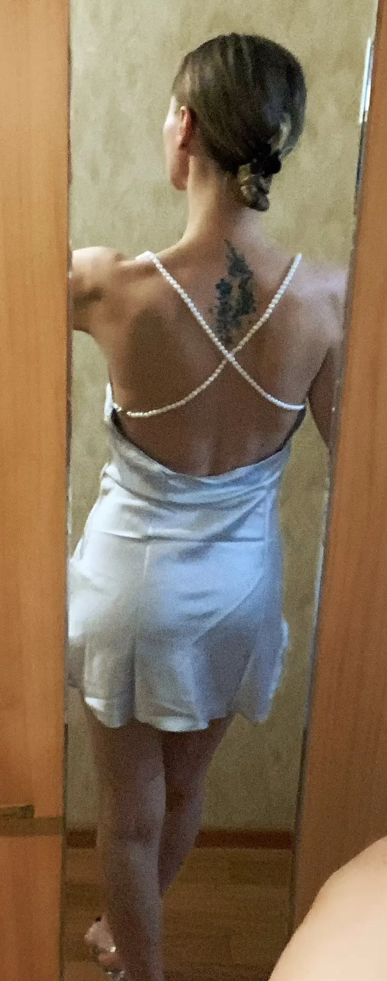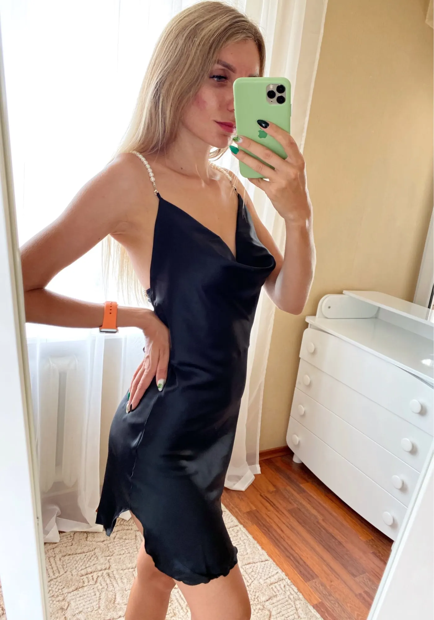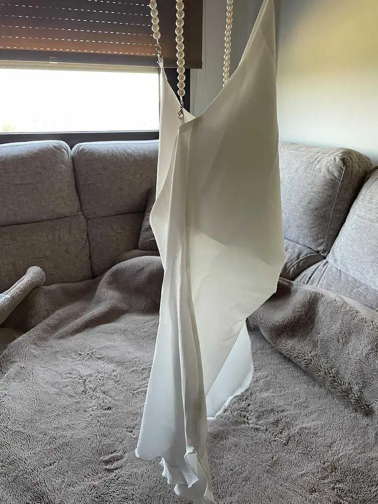 The dress is chic, looks very impressive. ⠀Size M, on my parameters 83-65-89 came up perfectly. On the photo of the store of the dress at the waist, I like the same as the village on me) On height 171, the length is critical, especially on the sides where the cuts. The straps are made in the form of pearls, removable, convenient to wear a dress and wash. The dress is made under the satin, but the fabric is thin. Delivery to Ukraine 3 weeks