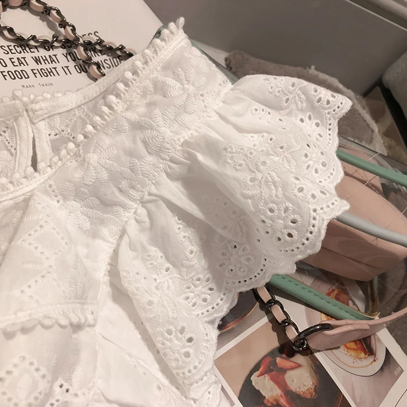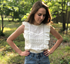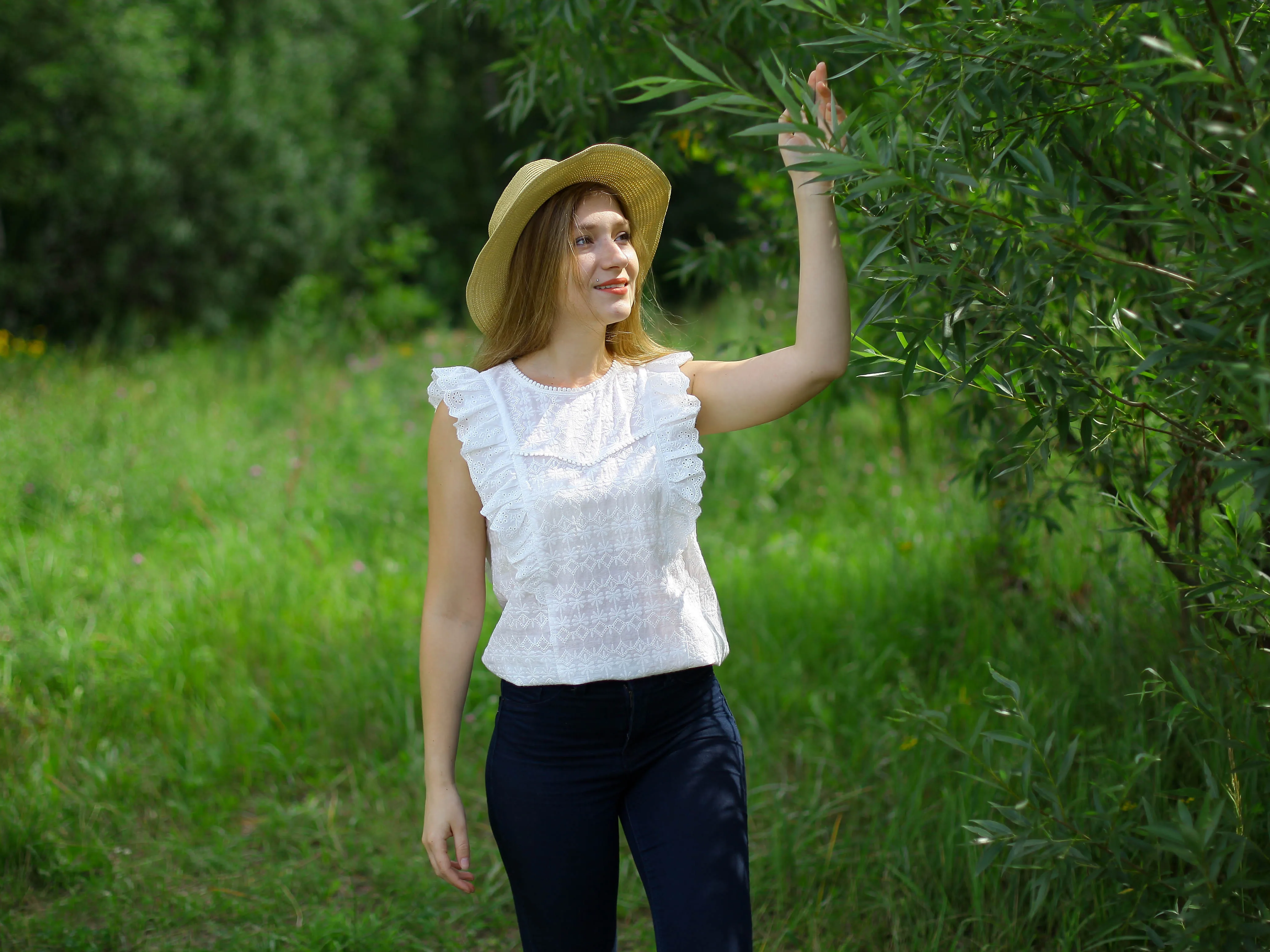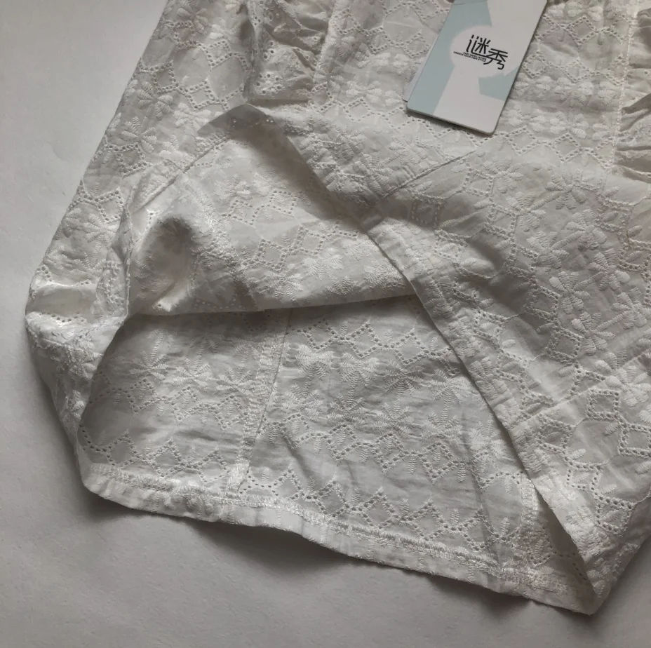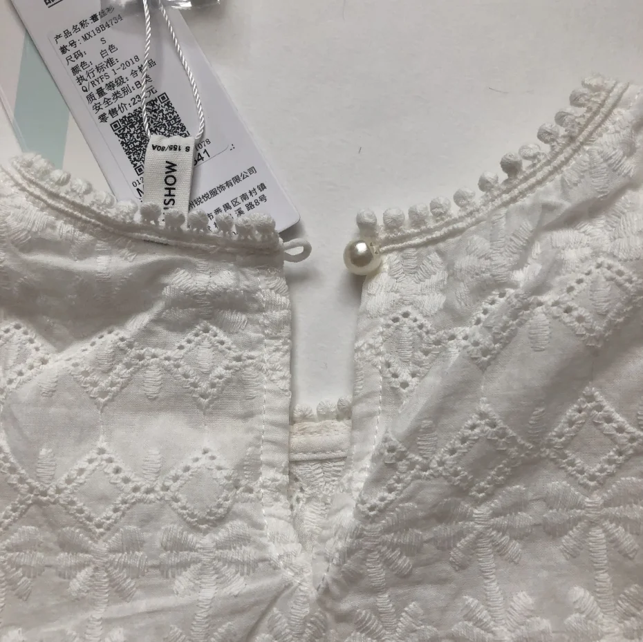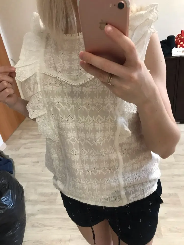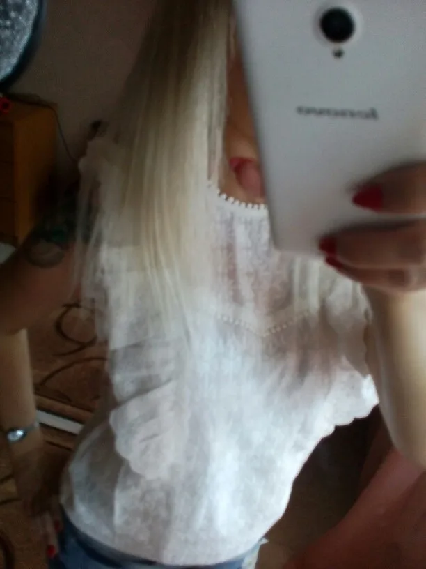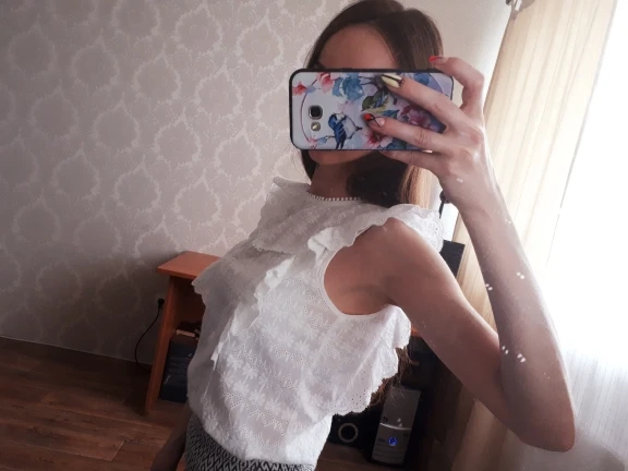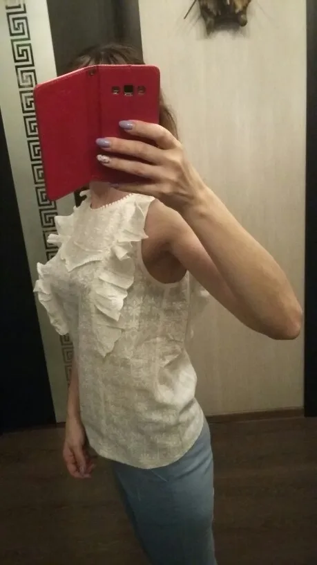 Delivery is very fast, less than two weeks. To choose from three sizes, on me m. My parameters are 85-70-92, height 163 cm-came up perfectly, sits freely. The blouse does not have fasteners, only the button behind. Cut free, does not fit. Color white. The product is decorated with frills, look harmonious. Material-cotton, does not stretch. The product is quite thin, with perforations-ideal for summer. The color is pure, without yellowness. Armholes are not small, do not stick. Openwork embroidery around the perimeter. Quality is excellent. To the goods do not complain. Comes with tags. There were no defects, no strings. The most successful purchase. I'm very happy. Boldly advise to order.