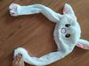 Just received the hat in the mail after about a week of purchases. It looks exactly how it did in the photo, except a little bit smaller. It fits my head, just isnt a full cover. The fur is super soft and the ears move wonderfully. The embroidery on the face and paws is flawless. Thank you so much!