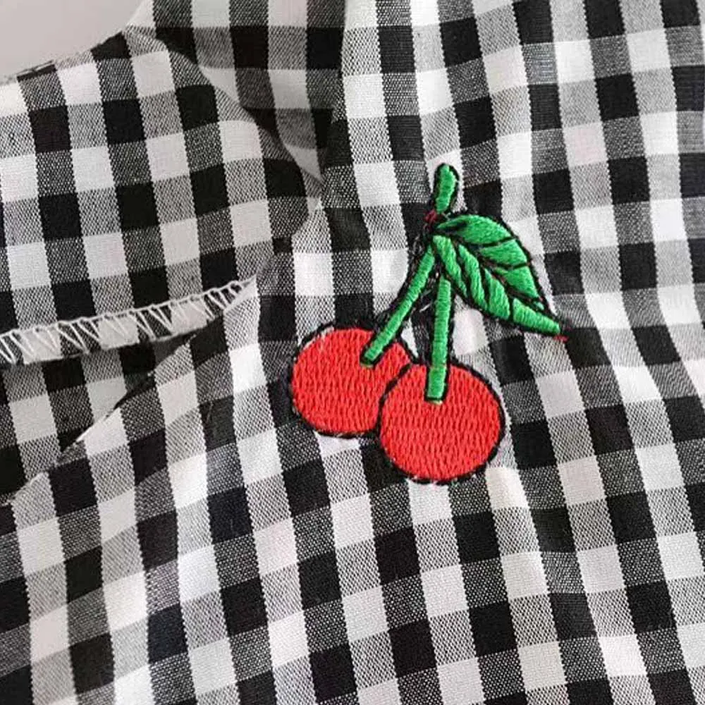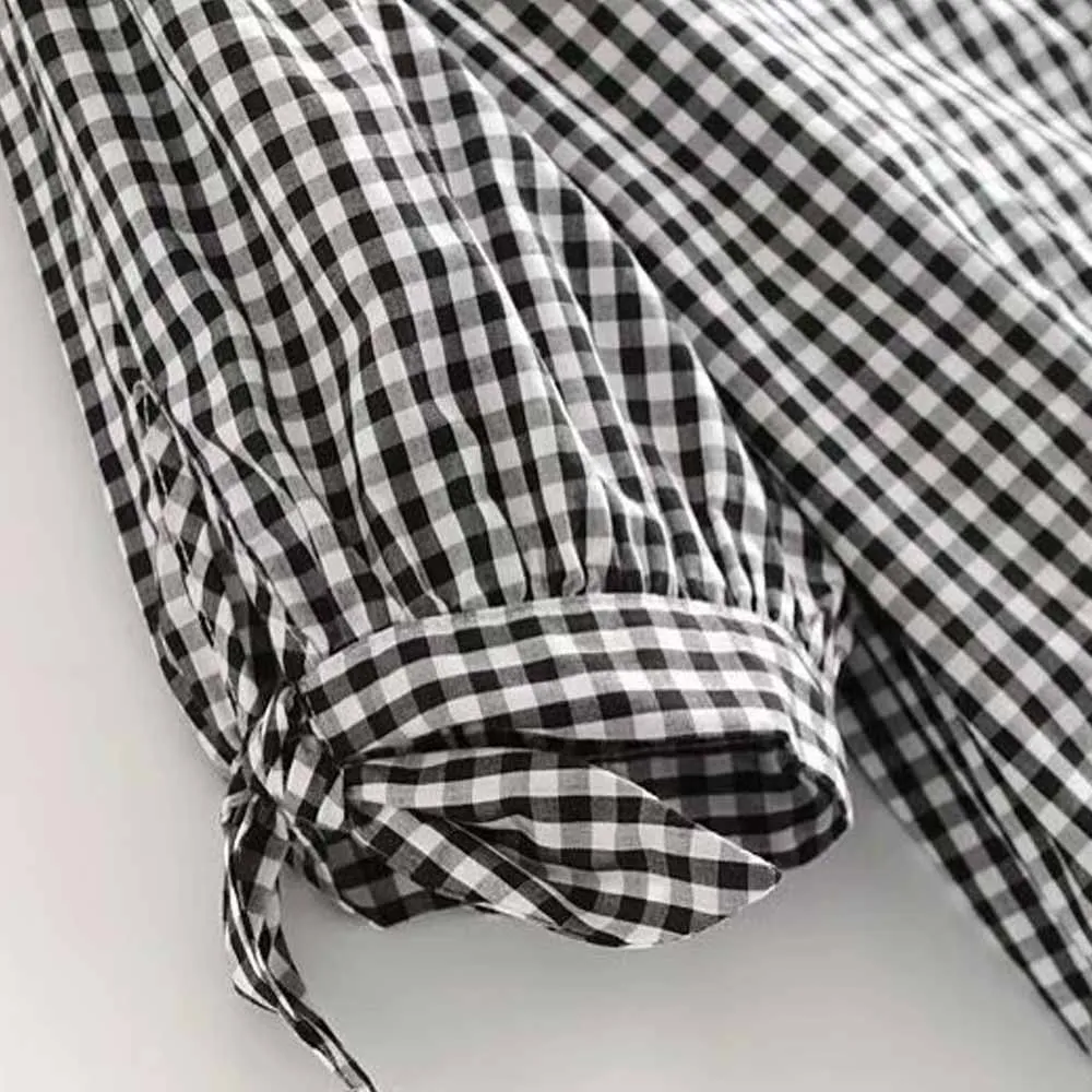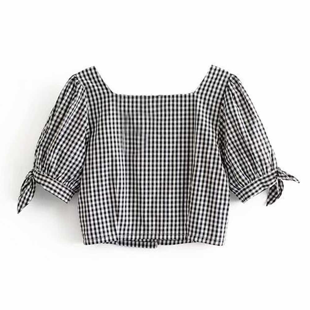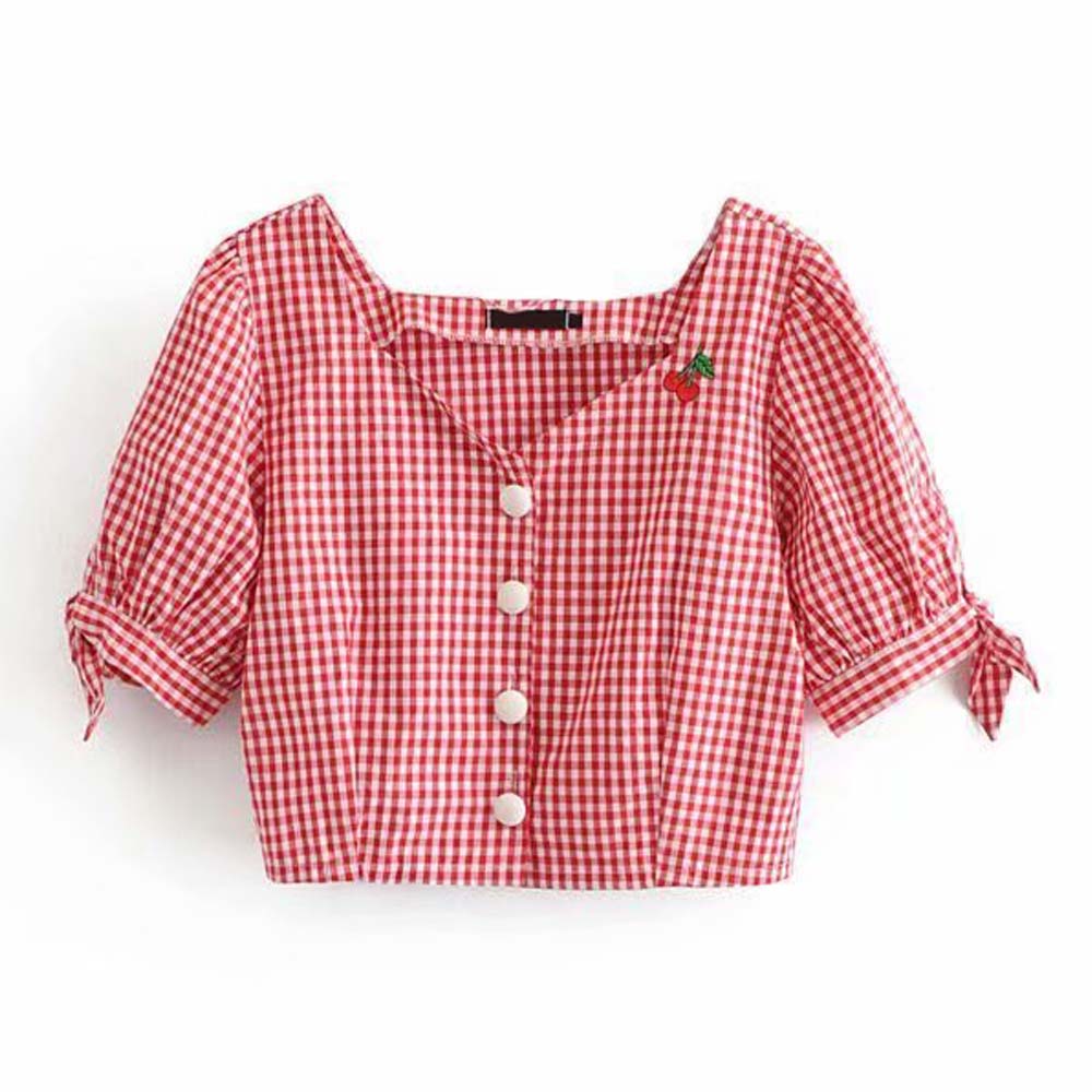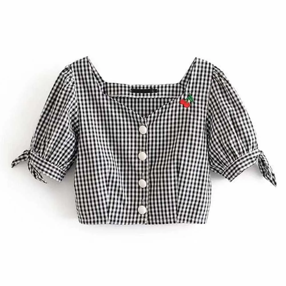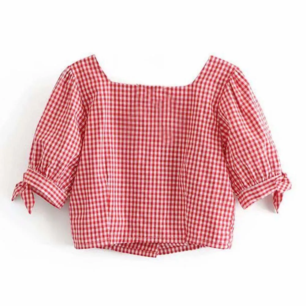 FREE SHIPPING Deep V-Neck Button Plaid Cuff Bow Crop Top
