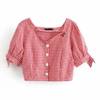 FREE SHIPPING Deep V-Neck Button Plaid Cuff Bow Crop Top JKP1087
