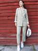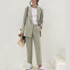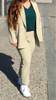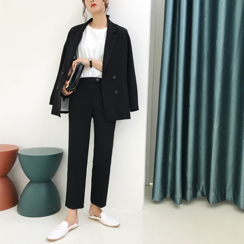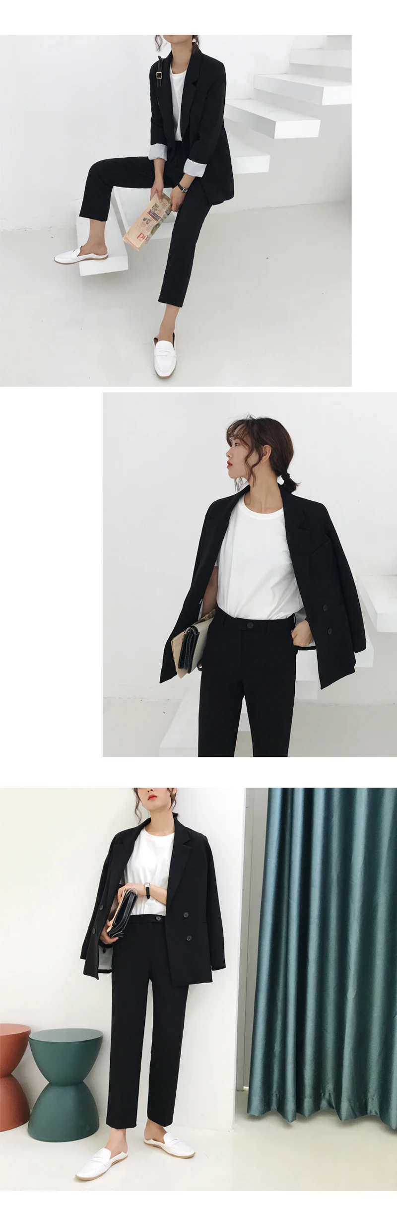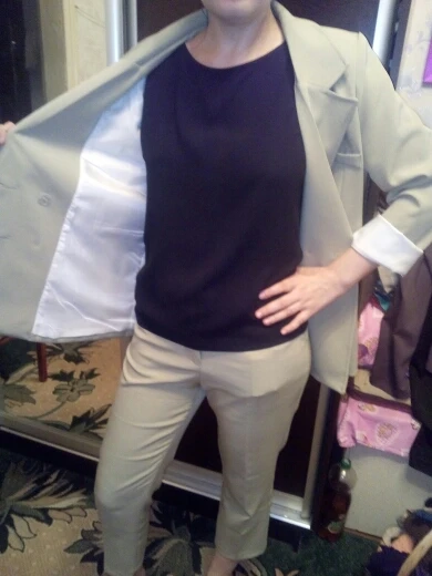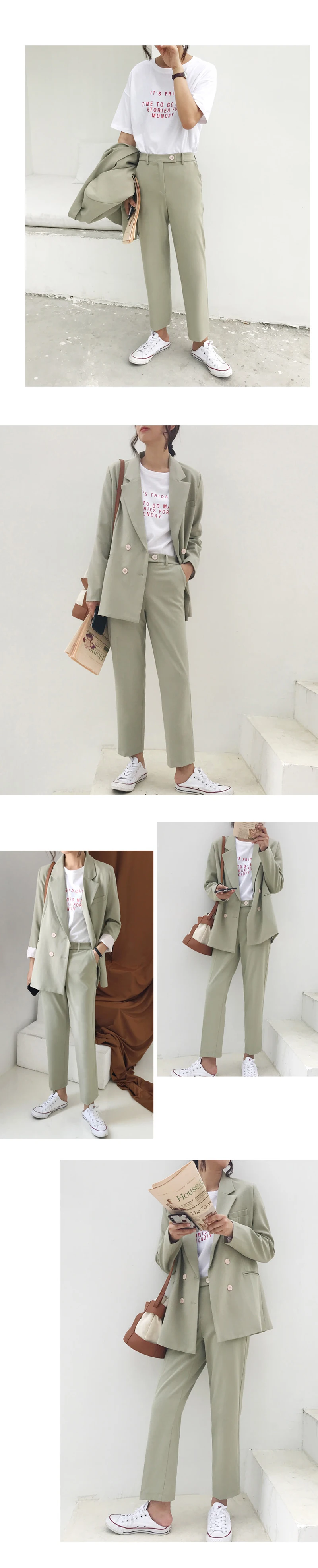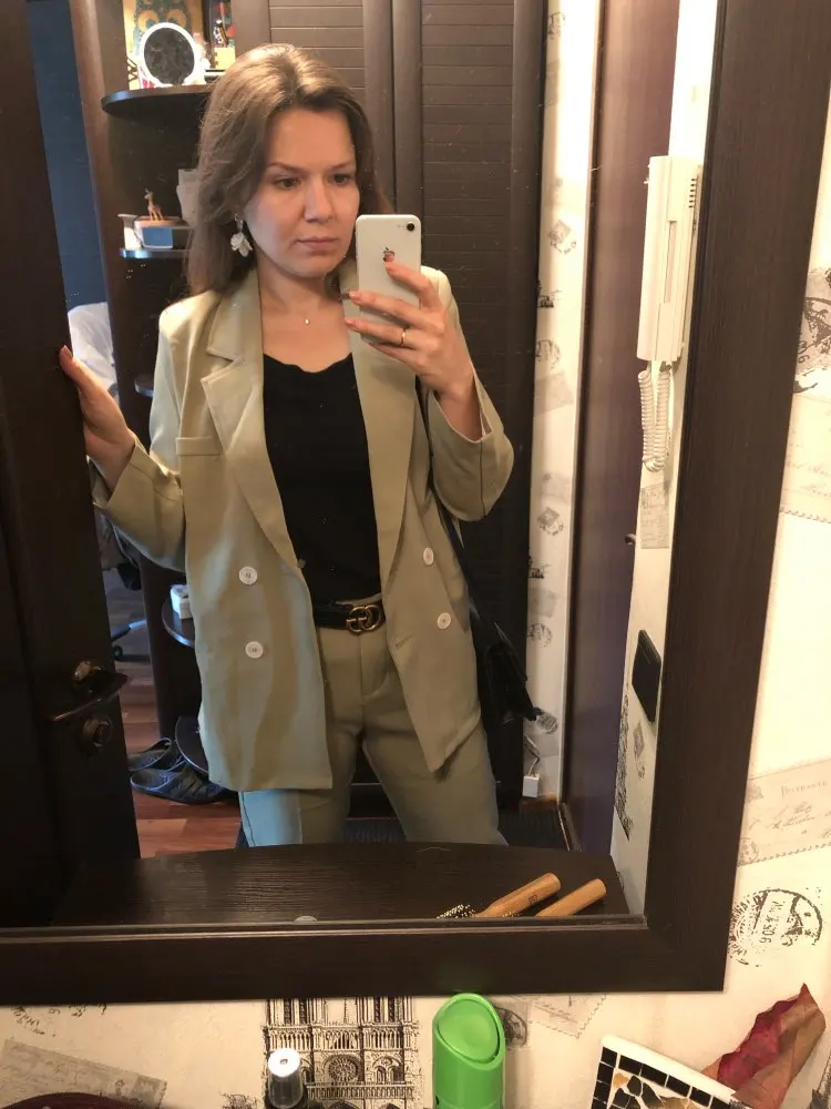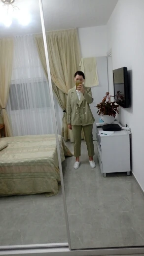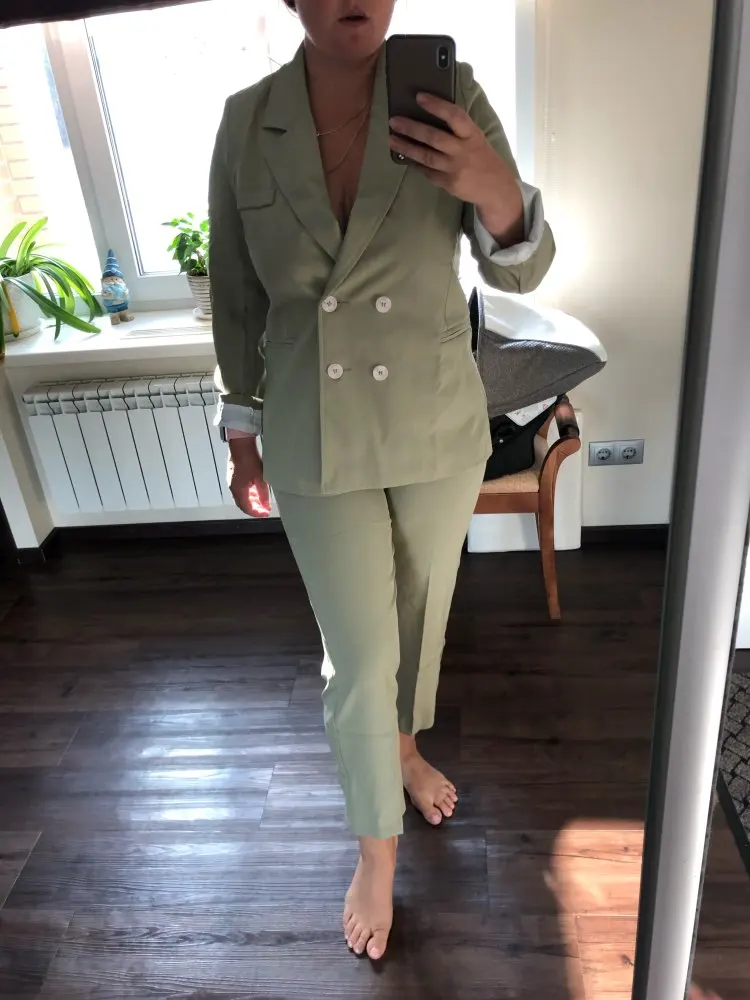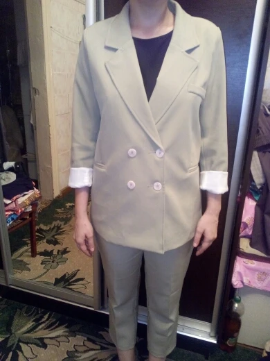 Girls it is unrealistically cool, very stylish and awesome quality fabric quality and sewing is excellent, the lines are even, the material is dense, but does not soar, pleasant to the body, there is also a white lining, the jacket holds the shape, sticking threads did not find, everything came in a zip package, everything neatly folded double-breasted jacket, Located in two rows of buttons, the shape is straight, fake pockets, the pants are shortened, the cut is straight there are deep pockets, the landing is high, the waist does not press. Material: polyester, spandex, cotton To choose 2 shades, now i want this in black On my parameters: (83/72/93) height 164 cm, weight: 53 kg on me size m sat just fine, the jacket is absolutely not big for me, the sleeves are of excellent length, the pants are shortened, as i said, it looks very stylish, Pants with a zipper closes on the button, they immediately had arrows, in general pants for sneakers or boats look just amazing