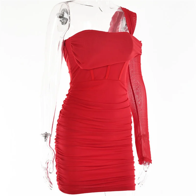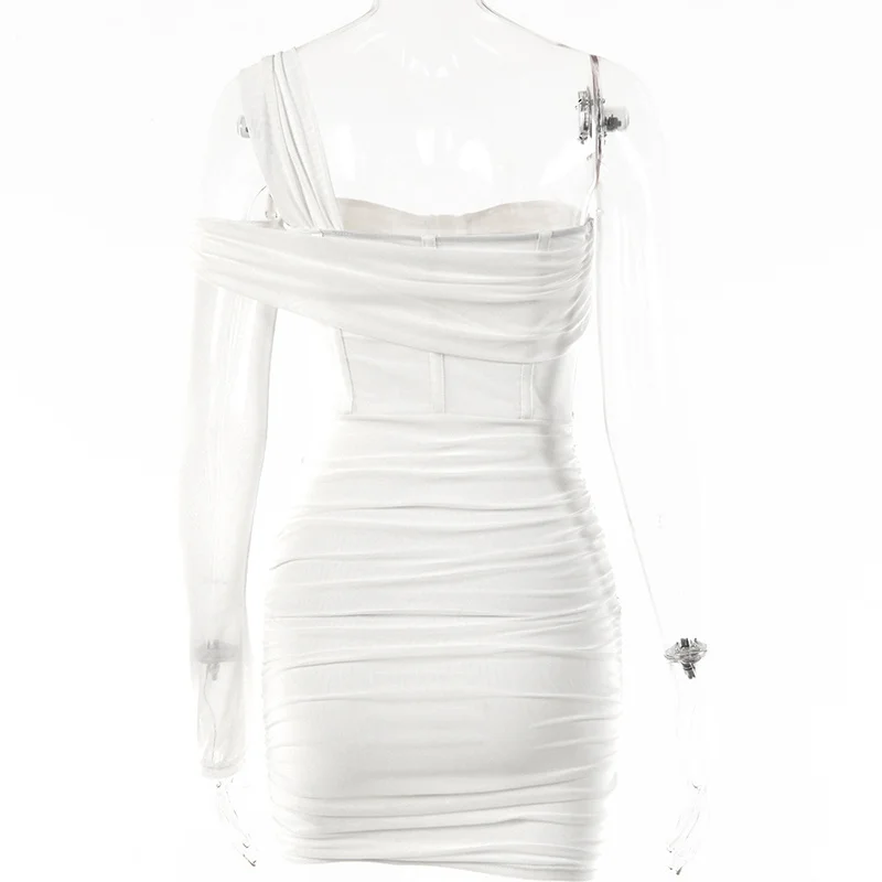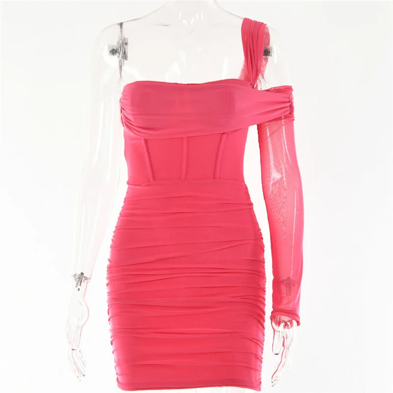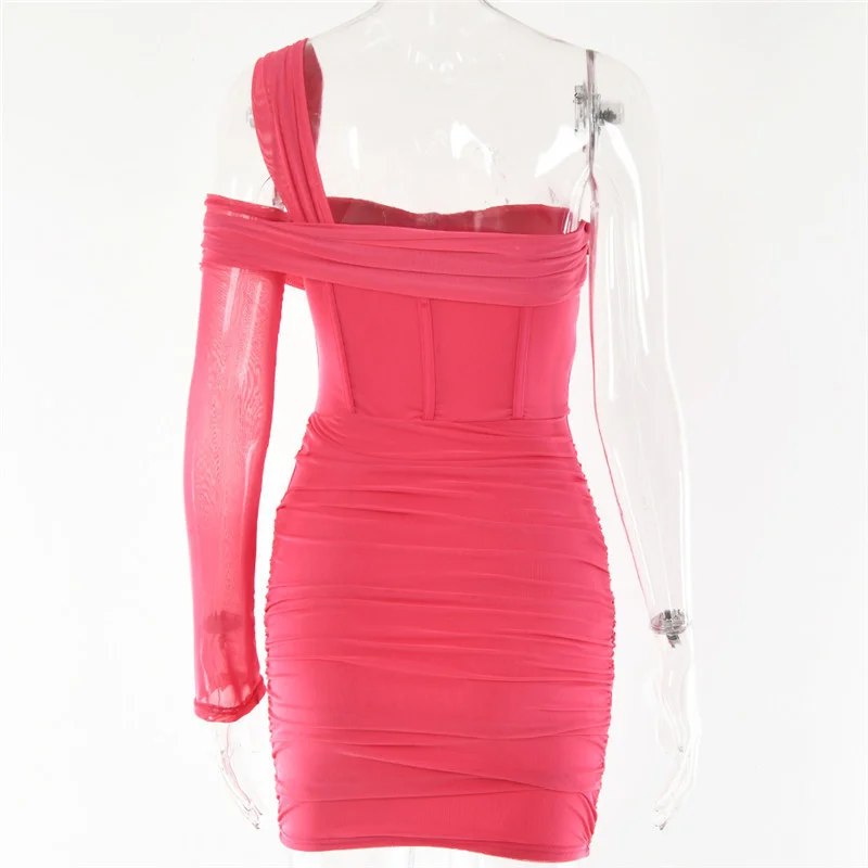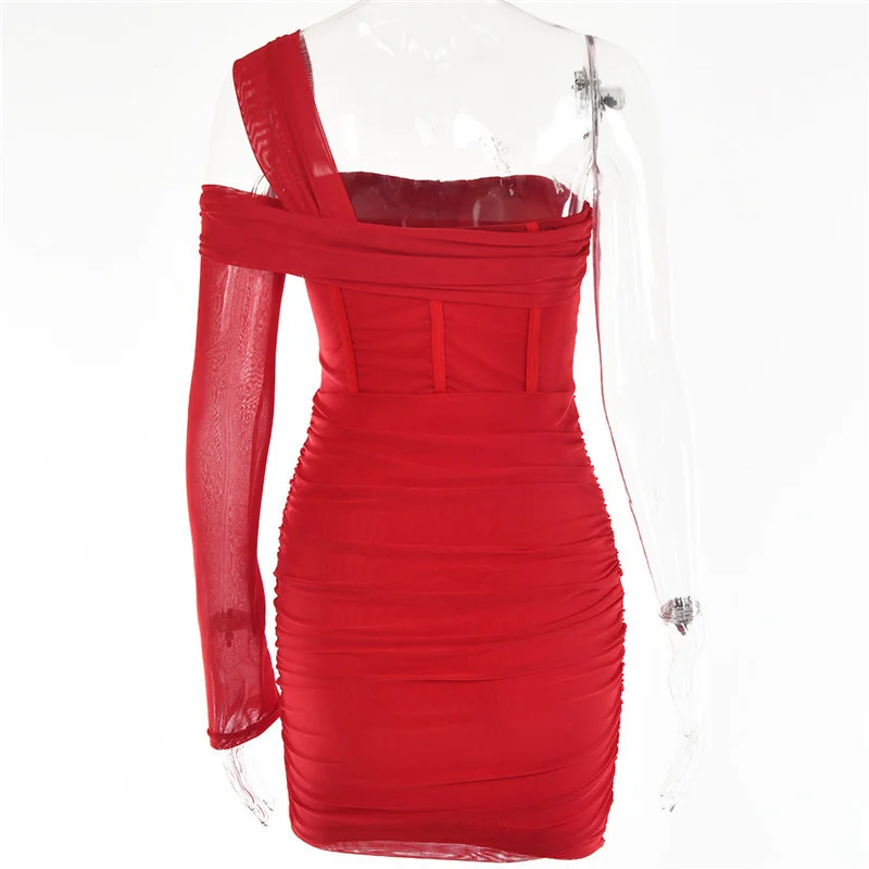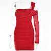 FREE SHIPPING Double Layer Mesh One Shoulder Zipper Mini Bodycon Dress JKP5887