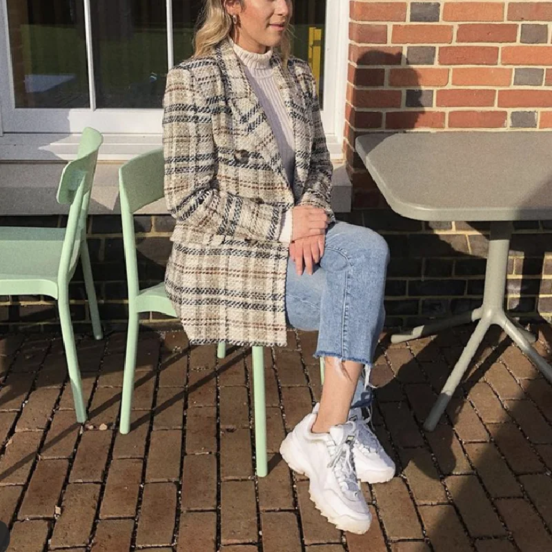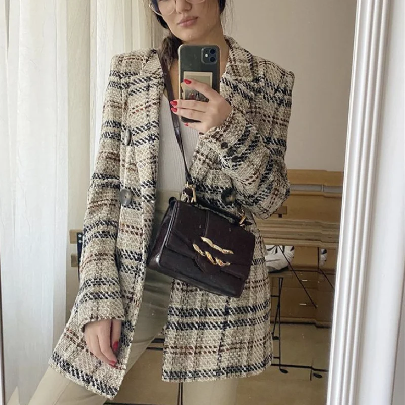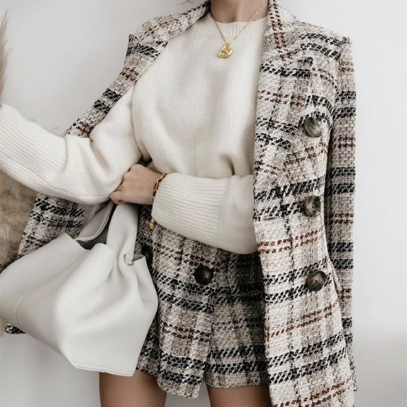 FREE SHIPPING Elegant Casual Blazer Suit Beige Plaid And Tweed Short Skirt JKP5942