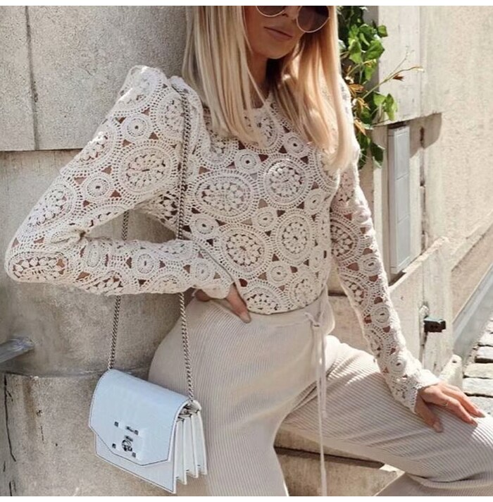 FREE SHIPPING Elegant Hollow Out Knitted Sweater Puff Sleeve Fashion Top Women 2019 Long Sleeve Jumper Autumn Winter Casual Knitwear JKP2620