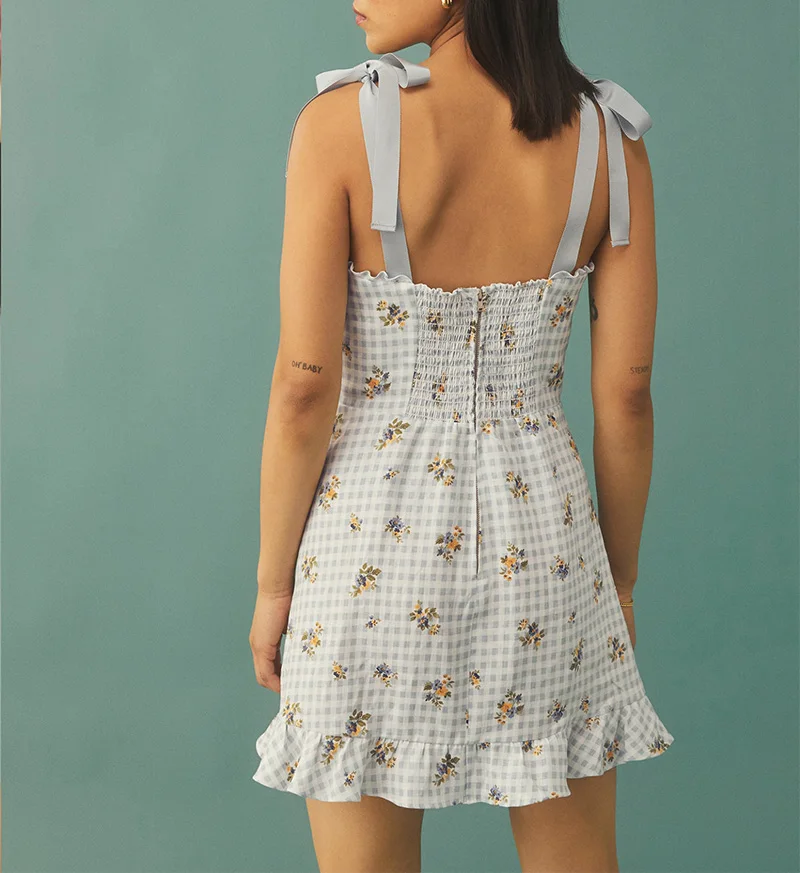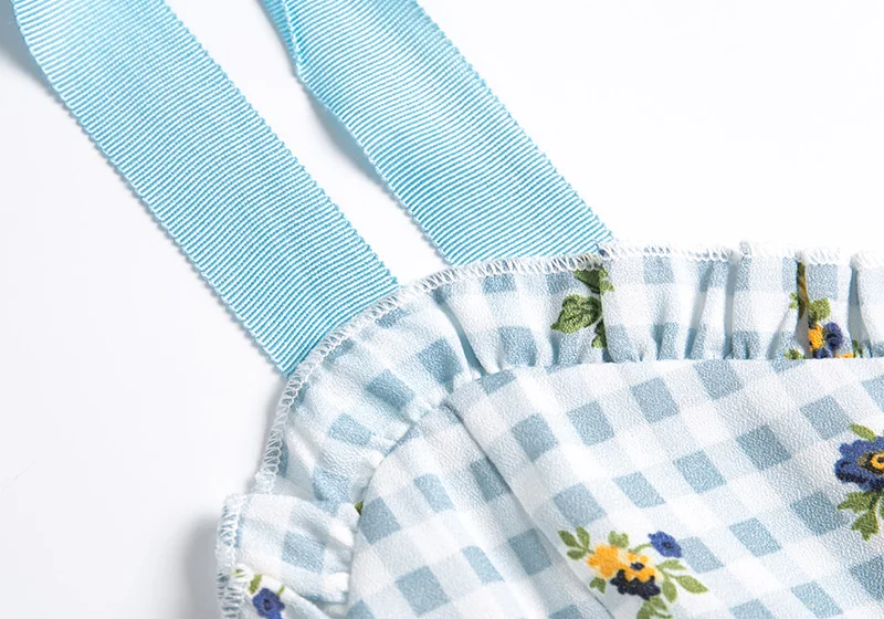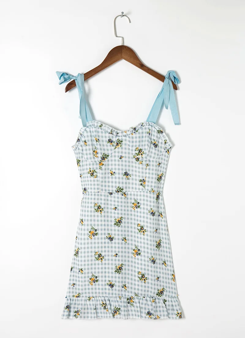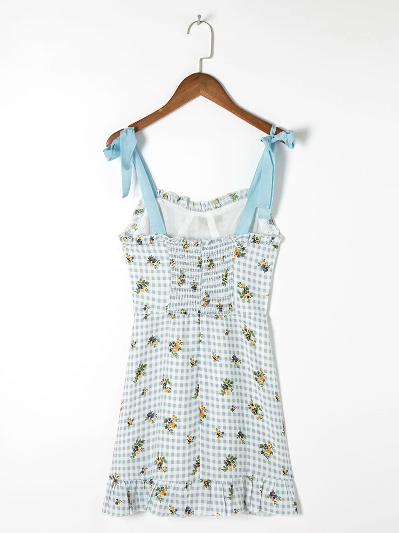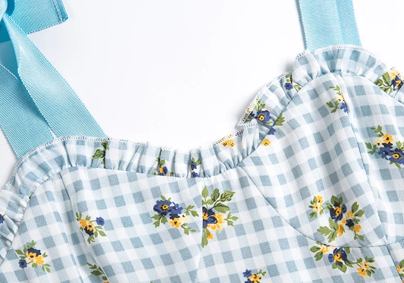 Free Shipping Elegant Sweetheart Neck Sleeveless Tie Strap Summer Dress Floral Print & Plaid Ruffle Hem Mini Dress for Women JKP7237